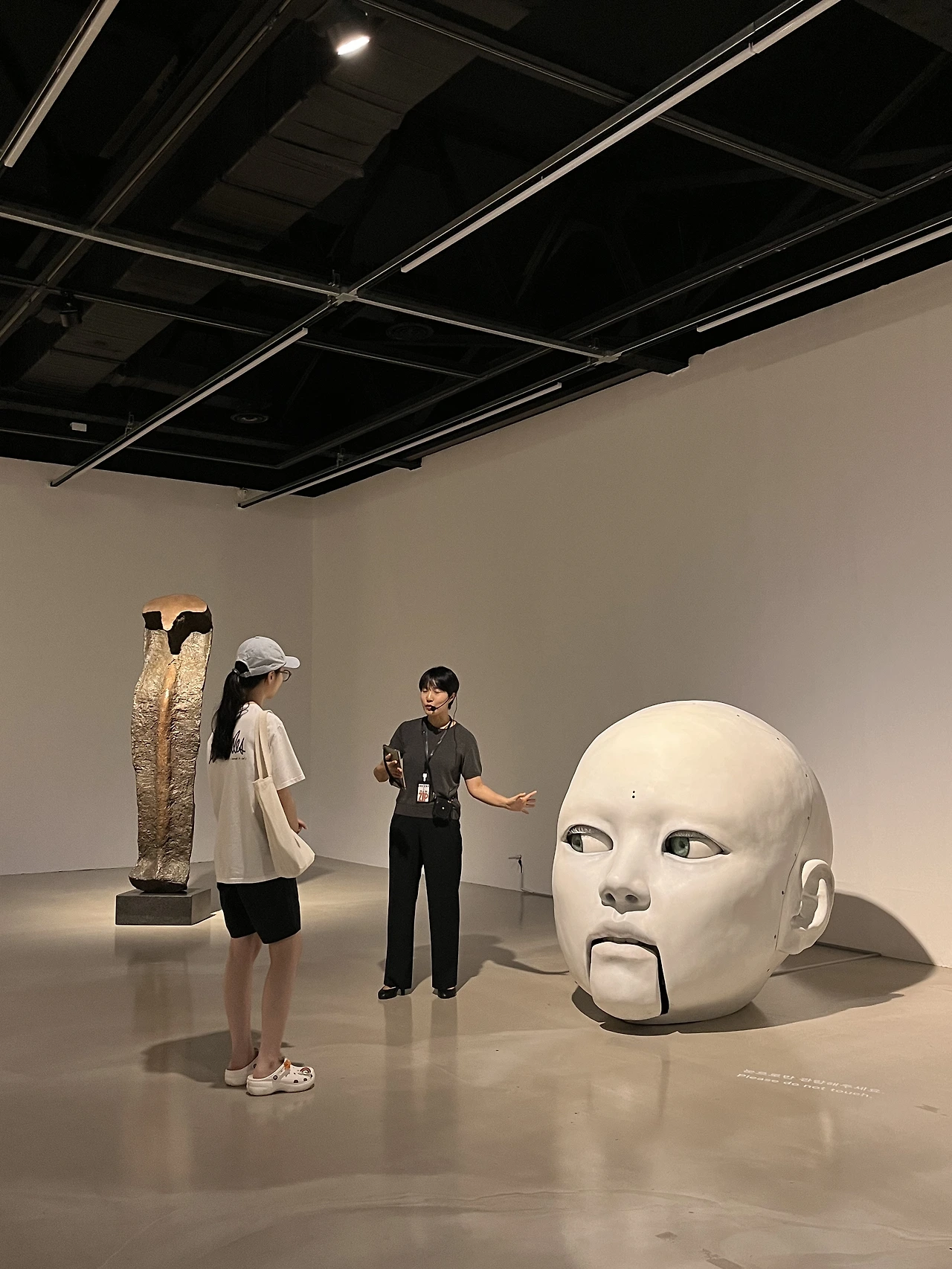 이 작품은 관람객과 대화할 수 있는 인공지능(AI) 기반의 인터렉티브 조각입니다. 현장에서 관람객이 음성으로 질문을 하면 음성인식 STT 프로그램으로 핵심 단어나 문구를 식별해 키워드로 인식한 후, 작품 자체의 테이터베이스를 기반을 대답을 추출하거나 생성형 언어모델을 이용해 대답을 한다고 해요. AI라는 건 데이터가 쌓이면 쌓일 수록 더 많은 학습을 하게 되고, 더 많은 데이터를 스스로 만들어 내게 됩니다. 그래서인지 이 작품을 부산비엔날레에서 몇 년 전에 먼저 경험하신 분의 이야기 따르면 그때보다 더 확실히 인간다운 말을 하고 있다고 합니다. 그때는 "안녕"이라는 말에 "안녕하세요"정도의 대답만 했다면 지금은 "안녕하세요, 밖의 날씨는 어떤가요?"와 같이 반문도 하면서 자연스러운 대화를 이끌기도 한다는 것이죠.