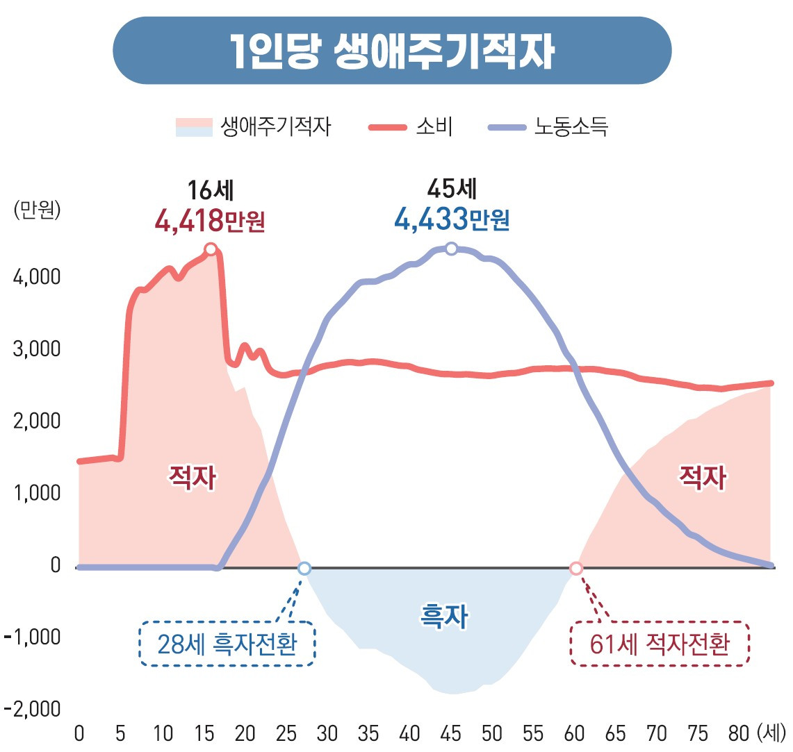 1+2. "문화가 가치 있게 생각하는 것들, 즉 문화를 더 강하고 풍요롭도록 강조하는 것들을 성취함으로써 존경을 얻어야 한다"는 문장에 동의합니다. (『소모되는 남자』에서 발췌) 그리고 자본주의 사회에서의 성취란 곧 돈을 의미하는 것 같고요. 국가데이터처에서 25년 9월 발간한 '2023년 국민이전계정' 통계에 따르면 1인당 노동소득과 소비는 28세에 흑자에 진입해 45세에 정점을 찍고 61세에 다시 적자로 전환된다고 합니다. 다른 말로 하면 28세부터 45세 사이 소득을 극대화해야 인생 초반과 후반의 적자를 겨우 만회하는, 자본주의 사회에서의 '실패한 삶'을 겨우 면하는 건 아닌지 싶기도 합니다. 김훈 작가는 같은 책에서 "돈 없이도 혼자서 고상하게 잘난 척하면서 살 수 있다고 생각하지 말아라. 아마 그럴 수도 있겠지만, 그러지 말아라. 추악하고 안쓰럽고 남세스럽다"고 했는데 45세라는 정점의 시기에 하루하루 가까워질수록 초조한 마음이 드는 것도 같습니다.