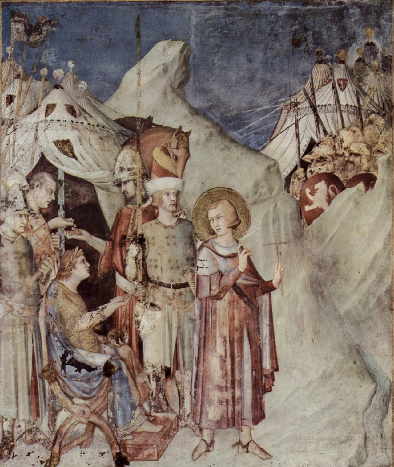 치마부에 또한 물감 개발에 집착했던 사람 중 한 명이었지만 조토는 작품 대부분을 기존의 방식으로 그렸습니다. 덕분에 조토의 작품들은 지금까지도 비교적 잘 보존되어 있습니다. 조토가 기존의 방식을 고수한 것은 선견지명이라기보다 그럴 필요가 없었기 때문이었습니다. 그는 빠르고 간결한 붓질로 인물에 형상을 부여하고 동작을 그려내는 데 천부적인 재주가 있었습니다. 그러면서도 얼굴의 표정에 있어서 섬세한 묘사가 가능했기 때문에 굳이 새로운 기술을 도입할 이유가 없었던 것입니다. 그래서 조토의 프레스코화를 감상할 때는 무엇보다 그의 붓질을 이해하는 것이 중요합니다. 아시시의 벽화들은 조토의 그러한 재능을 확인할 수 있는 가장 좋은 작품입니다.