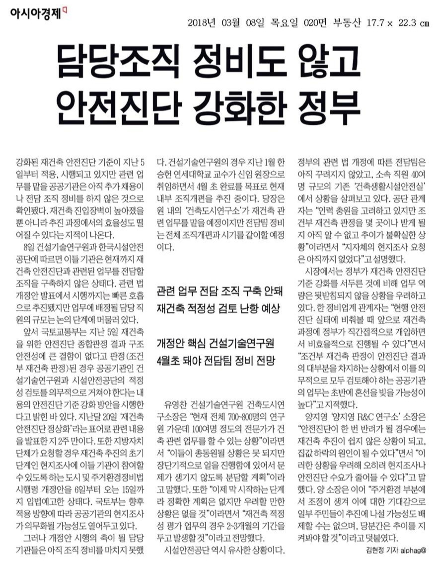 2018년 3월.. 정부에서 갑자기 "재건축 안전진단기준을 강화하겠다"라고 통보(발표)해버렸다. 내가 이 시리즈 1편에서 말했던 것처럼 주민들 중 나름 촉과 정보원(?ㅋ)이 있는 사람들이 있어서 2018년 1,2월에 이미 주민들끼리 정부가 안전진단을 강화할 것을 예상하고 움직이기 시작했다. 아래는 그 당시 나왔던 기사 중 하나..