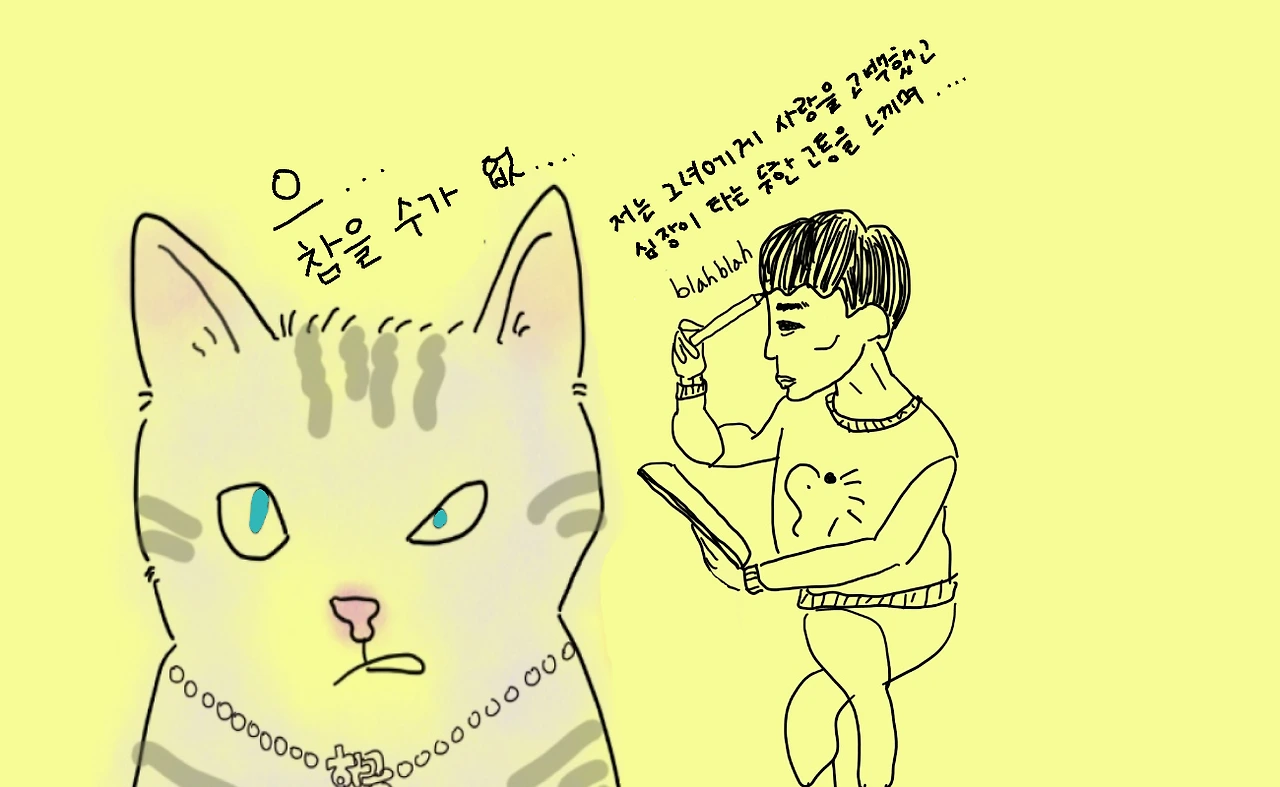 나는 영화를 본 다음 날, 하릅을 앞에 두고 홍상수를 연기한 문성근을 흉내 내며 똑같이 읽어 보았다. (사실 읽다가 항마력이 딸려서 몇 번이나 실패했다.) 하릅은 졸린 듯이 실눈을 뜨고 나를 지긋이 보다가 갑자기 화가 난 울버린처럼 손톱을 뽑아서 내 얼굴을 할퀴었다. 도대체 고양이라는 족속을 알 수가 없다.