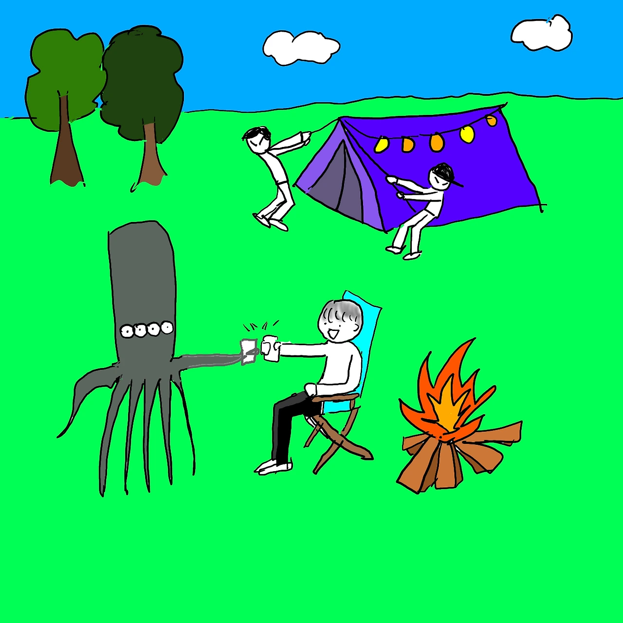 주인공은 더 이상 말하지 않고 대신 삼겹살을 입에 쑤셔 넣는다. 그리고 시시껄렁한 농담을 하다가 친구들에게 캠핑에 대해 묻는다.