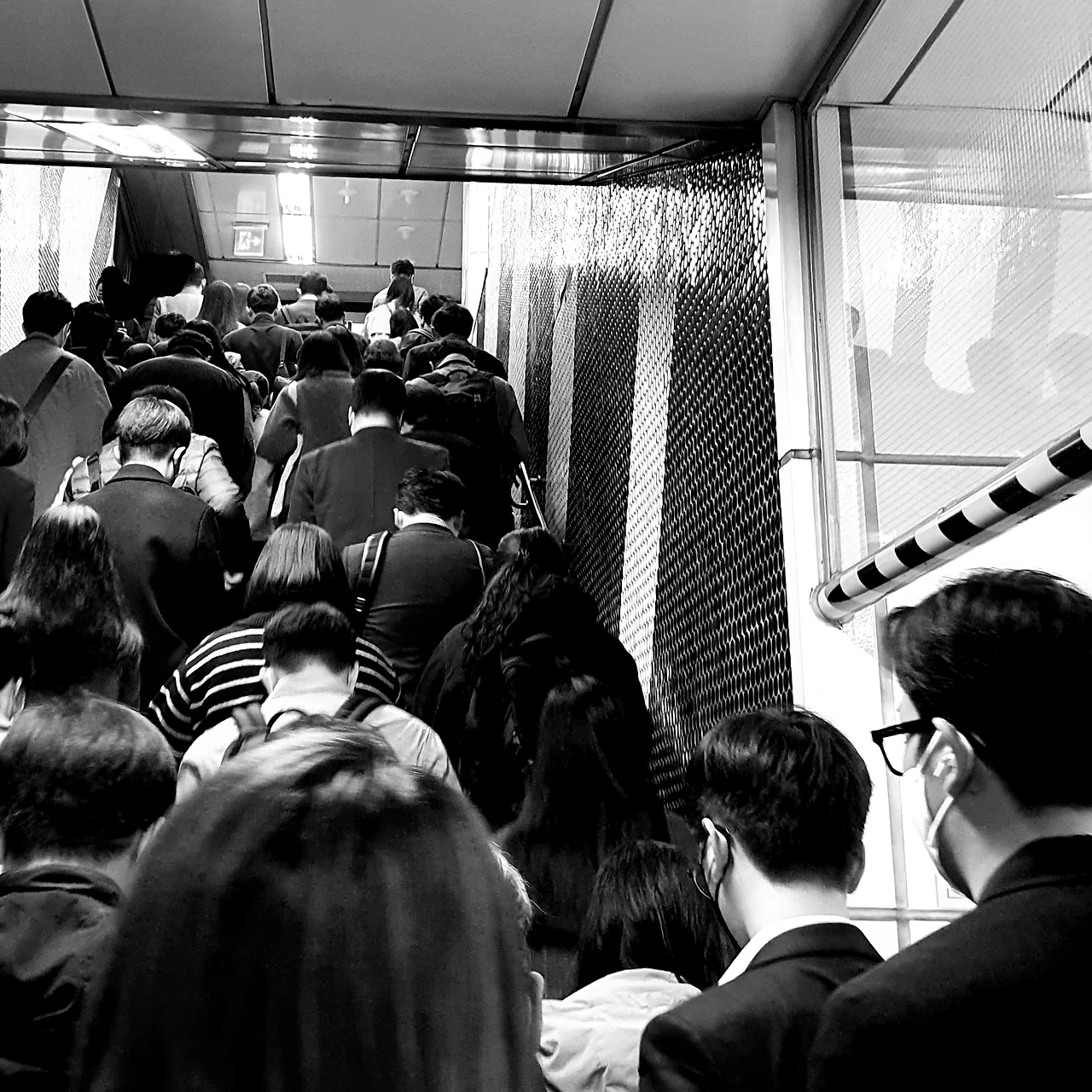 A가 빠져나가고 난 뒤 B그룹은 누가 선두라고 할 것도 없이 하나가 되어 움직였다. B그룹 사람들은 계단에 오르자마자 고개를 푹 숙이고 느릿한 걸음으로 계단을 터벅터벅 올라갔다. 앞사람의 발을 밟지 않기 위해 시선이 자연스럽게 바닥으로 향한 것이리라 생각해본다. 촘촘한 계단보다 더 촘촘하게 걷다 보니 앞사람이 잠시 휘청이면 그 줄 모두가 휘청인다. 가끔씩 고개를 획하고 들어 위쪽을 쳐다보는 사람들도 종종 눈에 띈다. 계단이 얼마나 남았나 확인하는 모양이다. 이 계단만 끝나면 진짜 이제 출근을 해야겠구나. 남은 계단을 확인하고 한숨을 푹 쉬는 소리가 발소리 사이를 헤집고 다닌다.