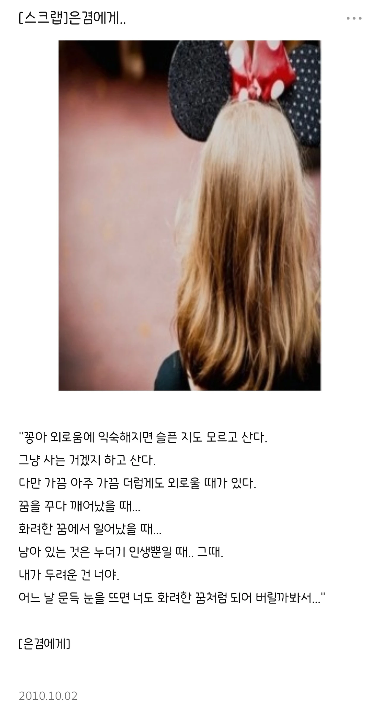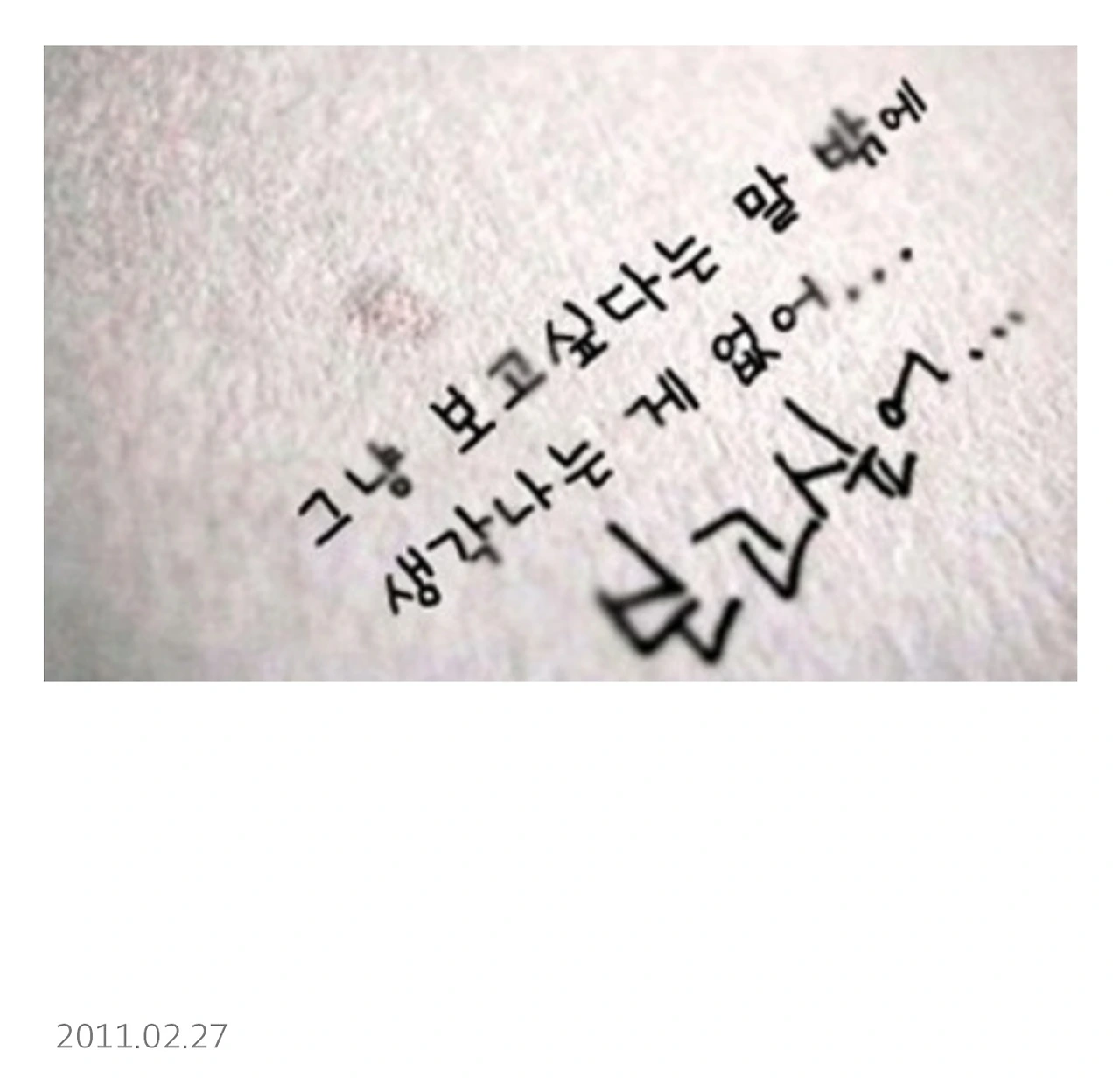 그러다 4월 초 싸이월드가 다시 오픈했다는 소식을 접했다. 서버상 문제로 아직 어플을 실행하고 겨우 로그인만 할 수 있을 정도였지만 나를 10년 전으로 데려가기에는 충분했다. 싸이월드 로고와 미니룸, 메인 컬러 밖에 보이지 않았지만 그 시절 노래가 들리고 친구들이 보이는 듯했다. 학교가 끝나면 시내를 활보하고, 주말마다 노래방이나 대공원을 안방 드나들 듯하며 놀던 때를 생각하면 괜히 하늘을 올려다보게 되면서 아련한 기분이 든다. 그 기분은 얼마 뒤 사진첩이 복구되고 나서 더 강해졌다. 집에서 술을 한잔 마시며 사진을 하나씩 보고 있으니 감탄이 절로 나고 소름이 돋았다. 오글거리는 사랑 글귀들과 차마 맨 정신으로 보기 힘든 인터넷 소설 명대사들, 10년 전 셀카나 내가 쓴 글들은 나를 완벽하게 그 시절로 돌려놓았다.