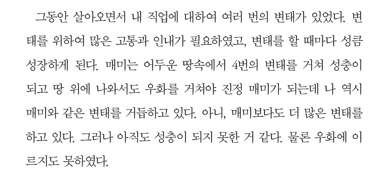 작가의 삶은 변화의 연속이었다. 해당 글에서는 직업에 대한 변태만을 언급했으나 이 책의 앞뒤로 가난했기에 정규 중학교에 입학할 수 없어 야학을 다녔다는 것, 전액 장학금을 받을 수 있는 철도고등학교에 입학했던 것도 스스럼없이 말하고 있다. 그렇게 졸업을 한 이후 철도청 부기관사를 거쳐 주택은행 은행원에 26년간 몸을 담았다가 퇴사 후 베트남으로 진출하여 사업을 시작하였다. 또한 여기서 그치지 않고 리모델링 회사의 관리 이사, 서울중앙지법 소속 법정관리기업 감사 및 CRO, KB공익재단 경제교실 강사까지 그의 커리어는 그야말로 변화무쌍했다.