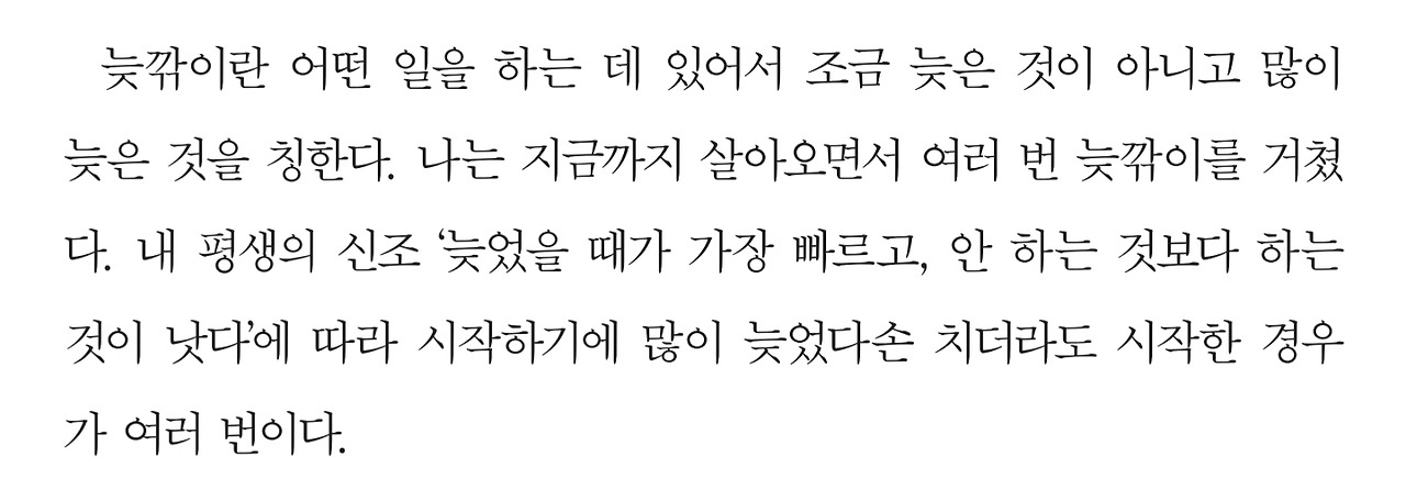 그 말이 틀렸다고 생각하지는 않으나, 보다 현실적이고 직설적인 표현으로 바꿔보면 “하늘은 멈추지 않는 자를 돕는다”라고 할 수 있겠다. ‘스스로 돕는다’는 말에 함축되어 있는 수많은 의미 중에서도 특히 배움과 도전에 있어서는 멈추지 않는 의지와 때를 가리지 않는 무모함이 가장 큰 몫을 해낸다. 가난했던 환경에서도 역경을 딛고 배움을 추구하고 도전을 멈추지 않았던 작가의 살아온 시간들은 앞으로 우리가 살아갈 시간에 분명한 영향을 주지 않을 수 없을 것이다.