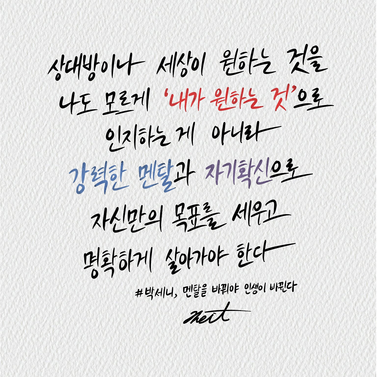 결국 멘탈이다. 상대방이나 세상이 원하는 것을 나도 모르게 ‘내가 원하는 것’으로 인지하는 게 아니라, 강력한 멘탈과 자기 확신으로 자신만의 목표를 세우고 명확하게 살아가야 한다.