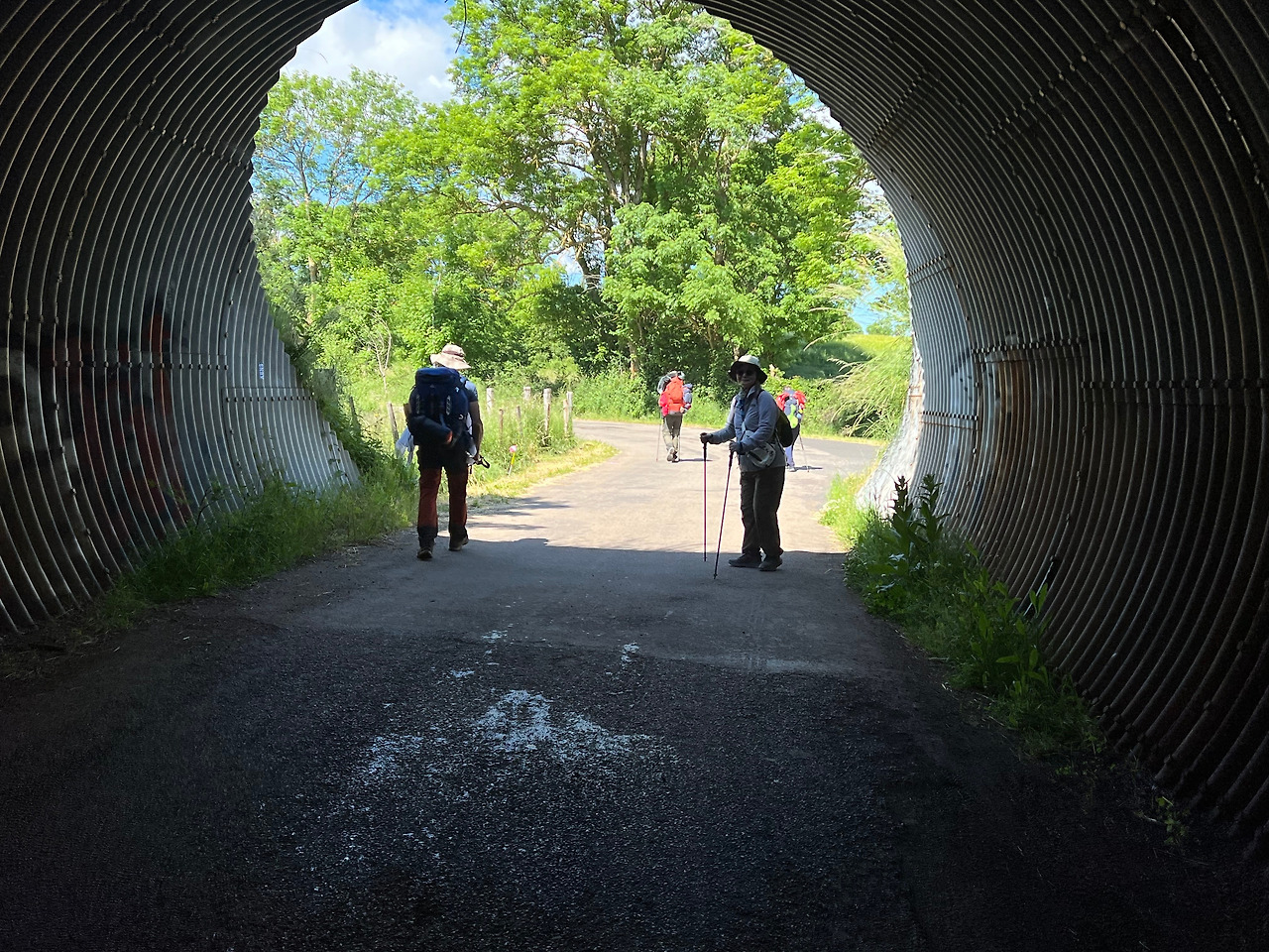 자, 이제 등산화 끈을 매고, 스틱을 부여잡고 길을 걷기 시작했다. 웬일인지 이 길엔 현무암이 많아 돌담도 많고 돌집도 있다. 우린 꼭 제주도 같다며 웃으며 걸었다. 넓은 초원엔 어린왕자에 나오는 여우가 생각날 정도로 넓은 밀밭과 야생화가 펼쳐졌다. 길을 가다보면 돌 십자가도 여기 저기 많이 세워져 있다. 물이 흐르는 미나리 깡엔 미나리 꽃도 피어있네. 중간 마을에서 쉬기도 하고 땡볕에 한 십 키로 이상을 걸었다. 땀도 나고 종아리도 딴딴해 지기 시작했다. 이제야 걷기 시작한 첫날인데, 비로소 나는 내가 엄청난 일을 저질렀다는 뒤늦은 깨달음이 왔다.