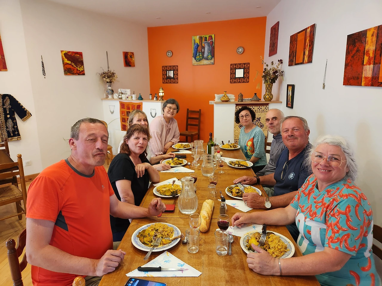 무사히 생 프리바 달리에에 도착했다. 숙소는 아주 예쁜 집으로 그 날 손님이 우리까지 모두 8명이었다. 주인 할아버지는 혼자서 음식을 만들고 집을 관리했다. 샤워실과 화장실은 공동으로 썼지만 2인실의 방은 아늑하고 창문으로는 볕이 쏟아 졌다. 저녁식사로는 여러 가지 야채가 들어간 카레 맛이 나는 수프를 한 사발 주고, 닭고기와 볶음밥을 푸짐하게 주었다. 디저트로는 사과를 갈은 것 같은 달달한 과일즙(?) 이었다. 나는 고기류를 별로 좋아하지 않는데, 기름이 많지 않게 오븐에서 구운 닭은 맛있었다. 확실히 먹을 땐 아무 걱정이 없다. 더구나 땡볕에서 하루 종일 걷고 나서 먹는 따뜻한 수프와 가정식 음식은 먹는 데 몰두하게 한다. 배가 터질까봐 걱정이지, 다음엔 무엇을 주나 기대하게 된다. 문제는 여덟 명이 함께 밥을 먹는데 두 시간여를 얘기하며 먹는 거다.