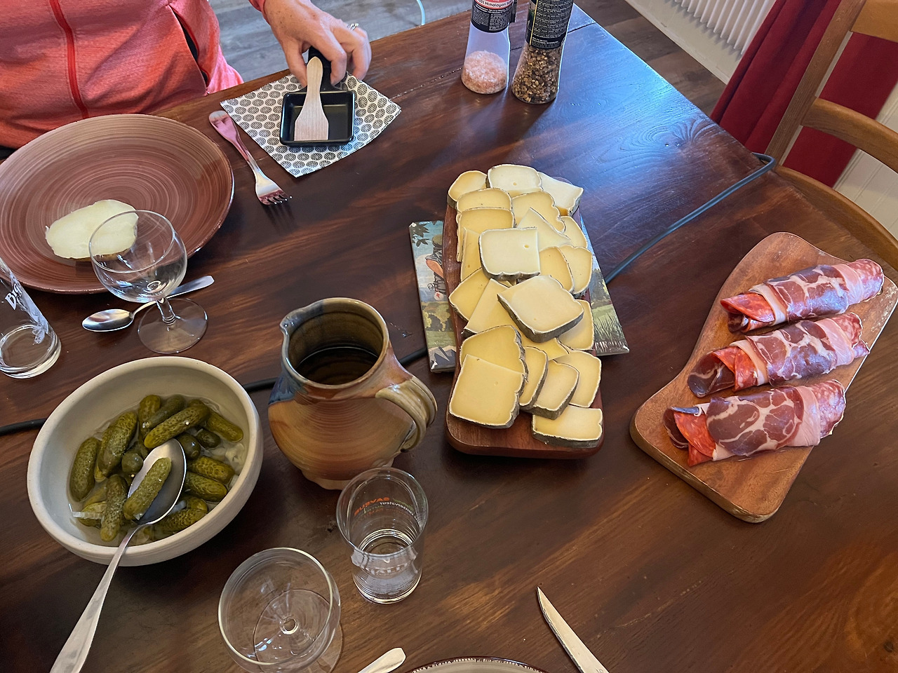 숙소에선 저녁을 엄청 풍성하게 잘 차려주었다. 샤워를 하고 나오니 주방에서 나오는 맛나는 냄새가 우리의 노고를 보상하는 듯 하다. 태어나 한꺼번에 그리 많은 햄을 먹어보기는 처음이다. 치즈도 내가 이제까지 평생 먹은 치즈보다 더 많이 먹은 듯. 커다란 냄비에 고구마를 쪄서 불 위에 올려놓고, 손바닥만 하게 작고 네모난 프라이팬을 하나씩 주면, 우린 앞에 놓인 여러가지 치즈 중 하나를 그 프라이팬에 올려 고구마 냄비 밑 불 위에 올려서 굽는다. 치즈가 녹으면 고구마나 빵 위에 얹어 먹는데, 어찌나 고소하고 맛있는지 여러 번 구워 먹었다. 햄도 맛났다. 모든 종류의 햄을 다 먹어 보았다. 하몽도 먹고...... 너무 배가 불러 우린 밖으로 나가 저녁 산책까지 좀 하고 들어왔다.