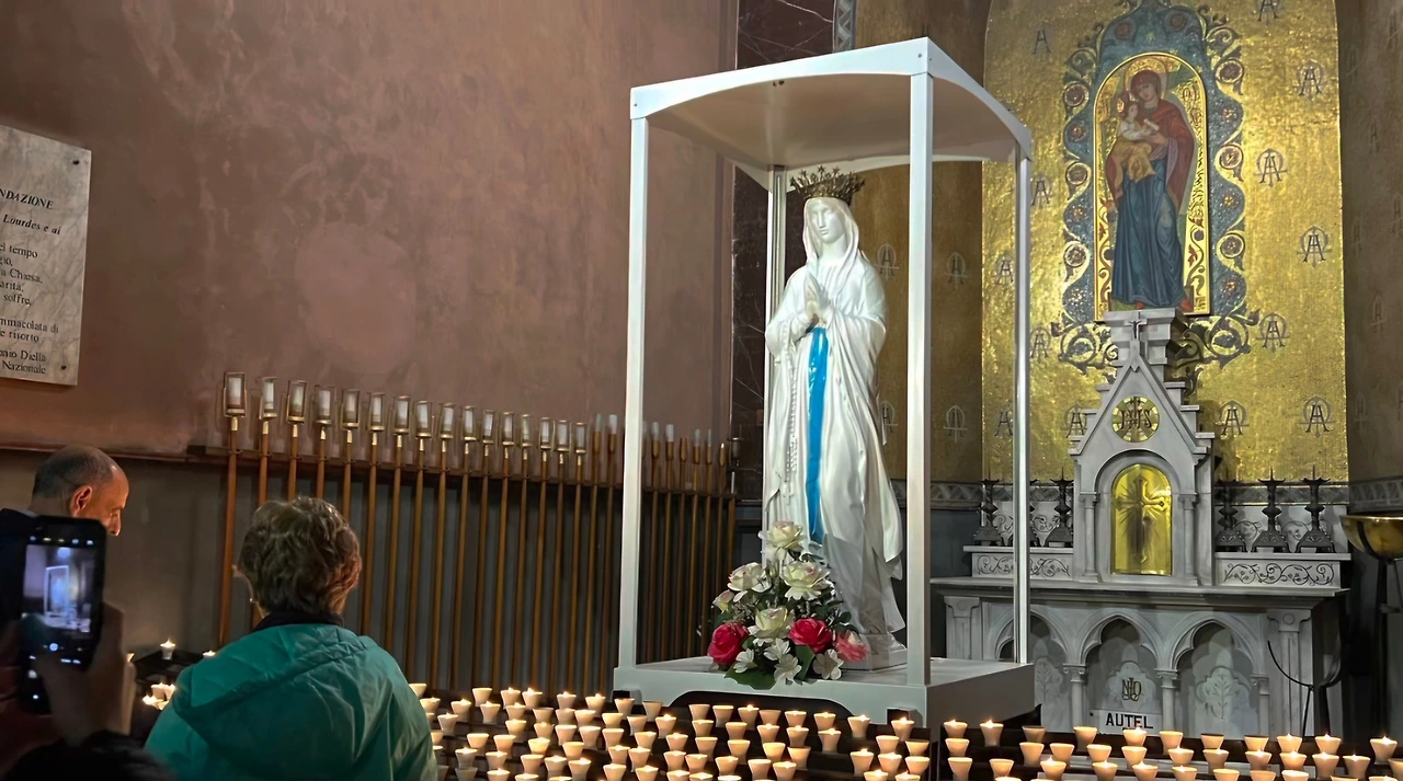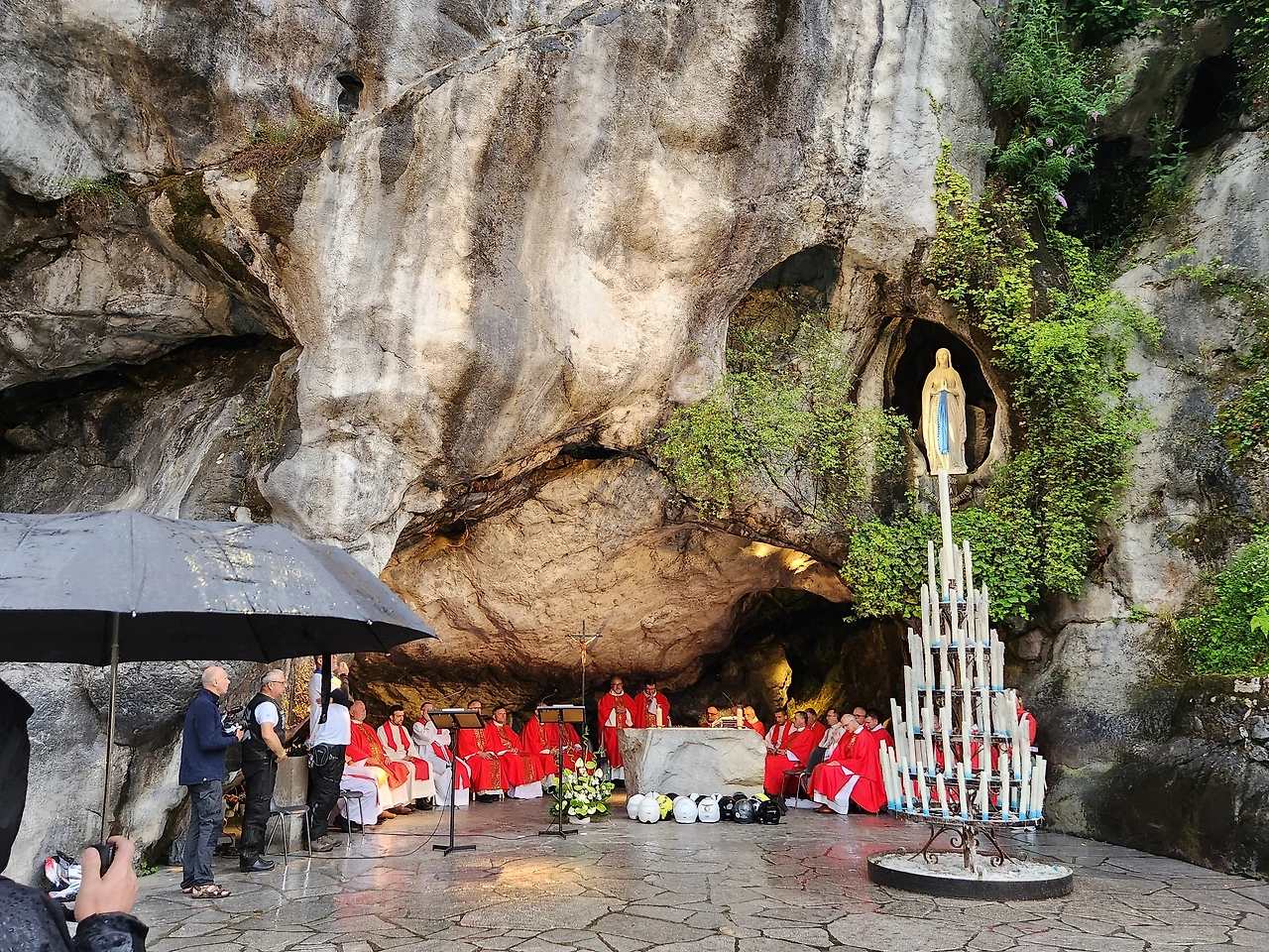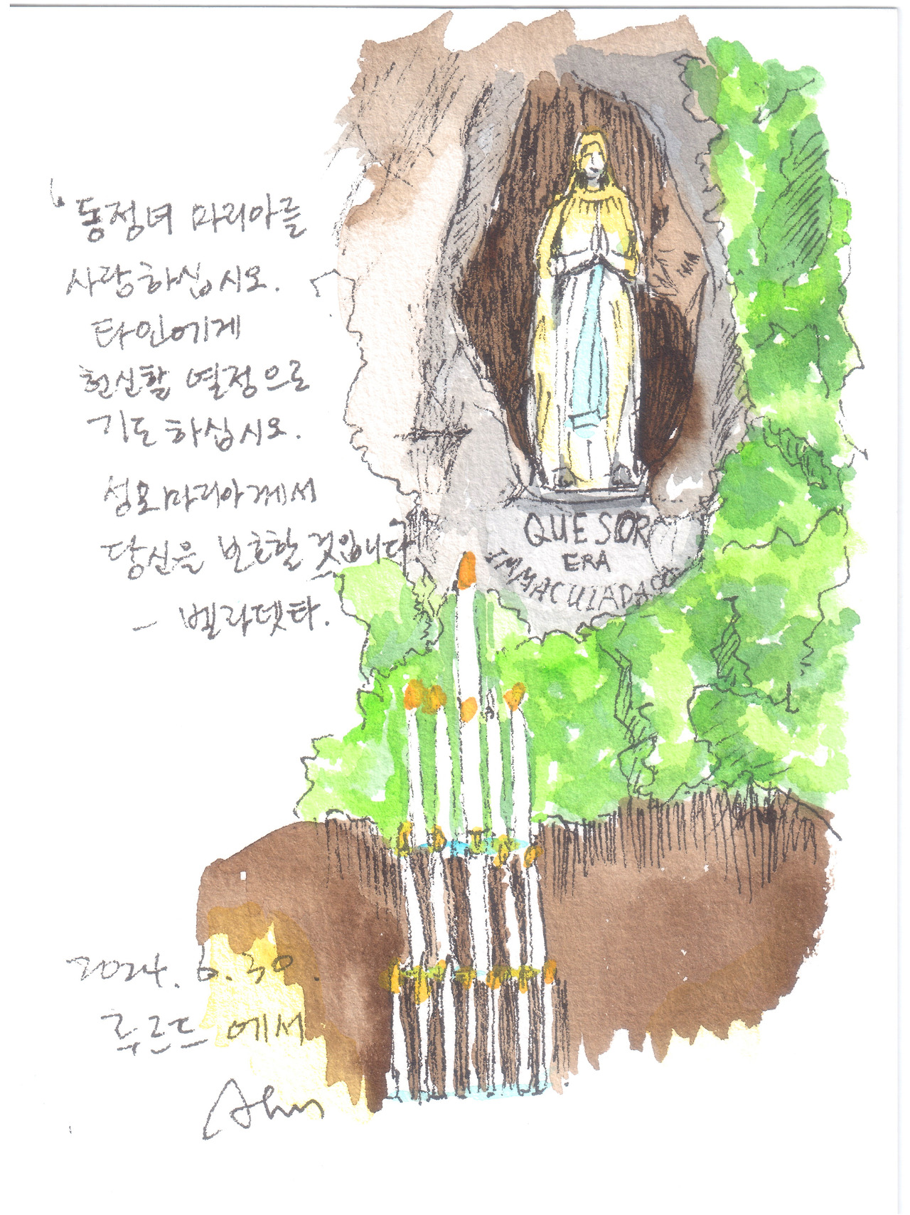 그곳엔 베르나데뜨 성녀가 처음 성모님을 만나 샘물을 발견한 마사비엘 동굴이 있다. 그 작은 동굴 앞에 제대가 놓여져 비가 오나 눈이 오나 미사가 드려지고 있는 것이다. 그러니까 1858년 2월부터 7월까지 14세의 소녀 베르나데트에게 성모마리아가 18번이나 나타나신 곳이다. 성모님은 그녀에게 ‘사람들에게 기도하고 회개하라고 전하라.’는 메세지를 주셨다. 무염시태 대성당은 바로 이 동굴의 20미터 위 암벽에 세워진 것이다. 비를 맞으며 동굴 성당의 제대에서 치러지는 미사를 감격스런 마음으로 올렸다. 동굴 안에는 처음 샘물이 솟았다는 곳에 유리를 씌워놓았지만 모두 지나가면서 볼 수 있게 해 놓았다. 한 평도 안 되는 동굴이지만 그 위에 높이선 대성당 보다 더 크게 느껴졌다. 성모님은 이 물로 아픈 사람들을 치유하라고 하셨단다. 그 후 많은 사람들이 씻고 바르고 마시며 몸과 마음의 치유를 받았고, 지금도 치유받기 위해 많은 이들이 몰려오는 곳이다.