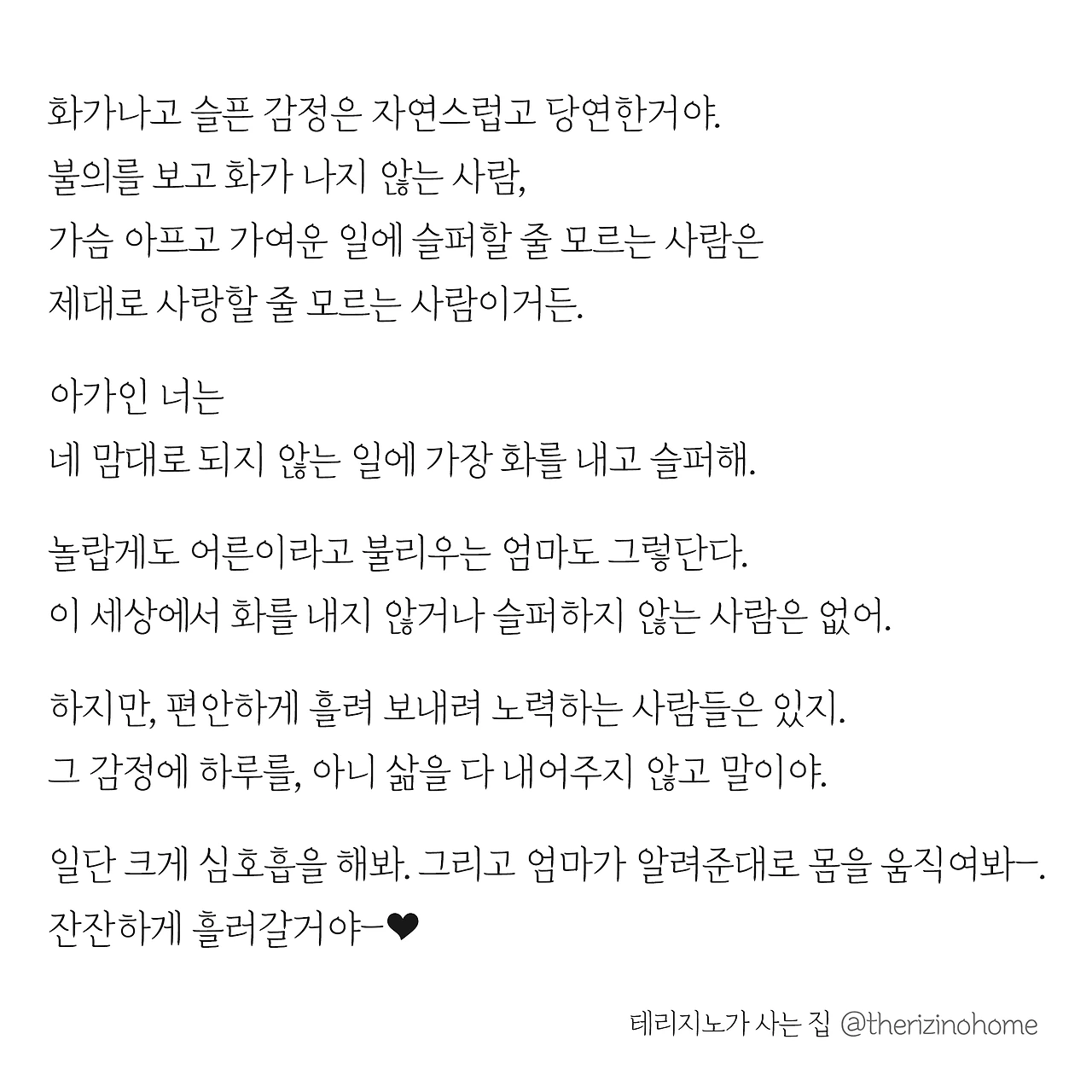 다섯 살 아이다운 발상에 한참을 웃었다. 아이 덕분에 십장생도 그림을 찬찬히 살펴보는 기회도 되었고 말이다. 아이는 다섯 살 아이답게 작은 일에도 세상을 다 가진 양 행복해하고, 사소한 일에도 지구가 멸망했다는 듯이 슬퍼하거나 화를 낸다. 이 작은 생명체가 내뿜는 거대한 감정의 폭발에 나도 덩달아 폭발하던 때가 한두 번이 아니었다. 어느 날 책에서 뇌 부분이 발달하는 과정 중에 있는 아이들은 극심하게 화를 내며 화와 분노를 조절하는 뇌기능이 아직 미성숙하다는 사실을 알게 되었다. 그러니까 아이는 아직까지 화가 나면 멈출 수 없는 구조의 뇌를 가지고 있는 것이었다. 아 가슴을 쓸어내렸다. 그 이후 나는 아이가 화를 내는 행동 자체에 관심을 두기보다는 화를 흘려보내는 차후 행동에 더욱 관심을 두기 시작했다.