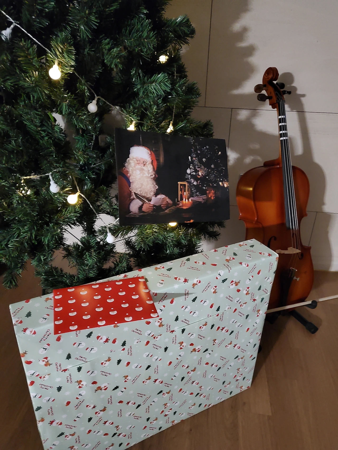 상상에서 빠져나와 차가운 사과주스를 벌컥벌컥 마시고 트리 밑 아이의 선물을 바라보고 있다.