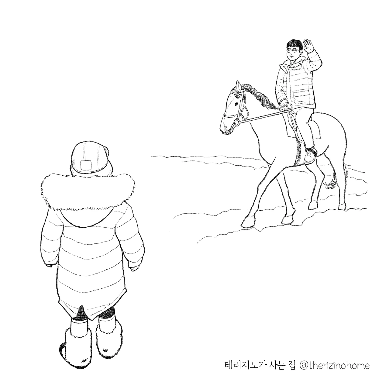 P.S 그림은 작년 새해 다섯 살이 된 테리지노가 말을 보고 싶다고 해서 급하게 달려간 곳이다. 올해는 그 어디로도 달려갈 수 없지만……