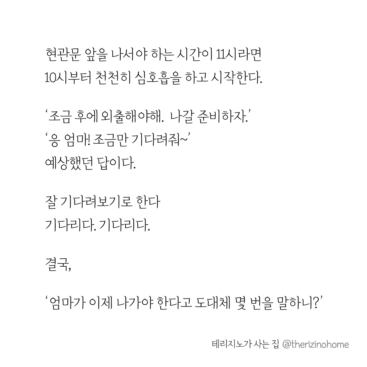 한가하던 아이는 준비하고 나가자는 말이 나오면 그때부터 바빠지기 시작한다. 말 못 하는 아기 일 때는 나가려는 순간에 응아를 한다거나 갑자기 울어서 현관문 앞에서 나의 진을 빼놓더니, 이제는 조곤조곤한 목소리로 기다려 달라며 나의 인내심을 매일같이 시험한다. 어떤 날은(아이에게 이런 기분이 들어도 괜찮을지 모르겠지만)... 꿀밤 한 대 맛을 보여주고 싶은 심정이다.