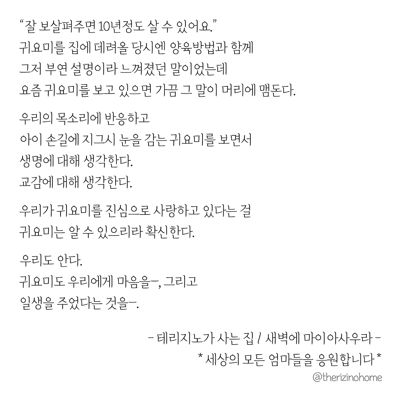 새벽에 일어나 귀요미를 가만히 들여다보고 있자면, 그 시간이 주는 고요함 때문인지 반려동물이란 우리에게 어떤 의미로 다가오는 것인지 살짝 진지하게 생각해보게 된다.