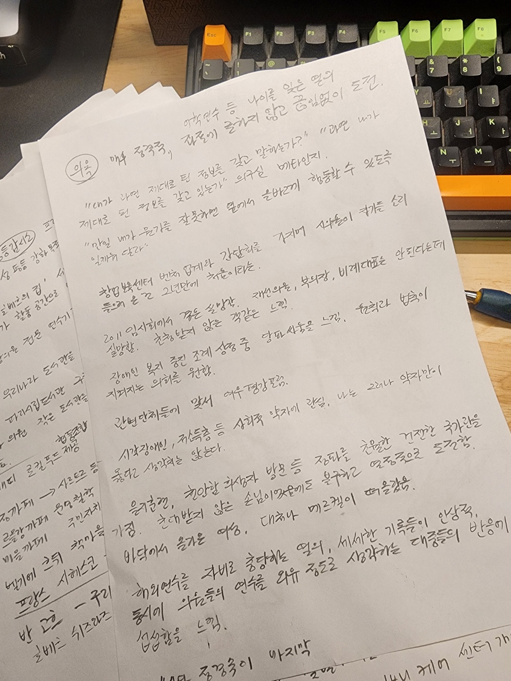그러므로 이 시간에도 나는 세상에 아주 뒤떨어진 병신마냥 펜슬로 A4 용지에 애써 육필을 갈겨쓰고 그것도 모자라 구글 독스까지 병행하는 그 뻘짓의 수고로움을 기꺼이 감당하는 것이다.