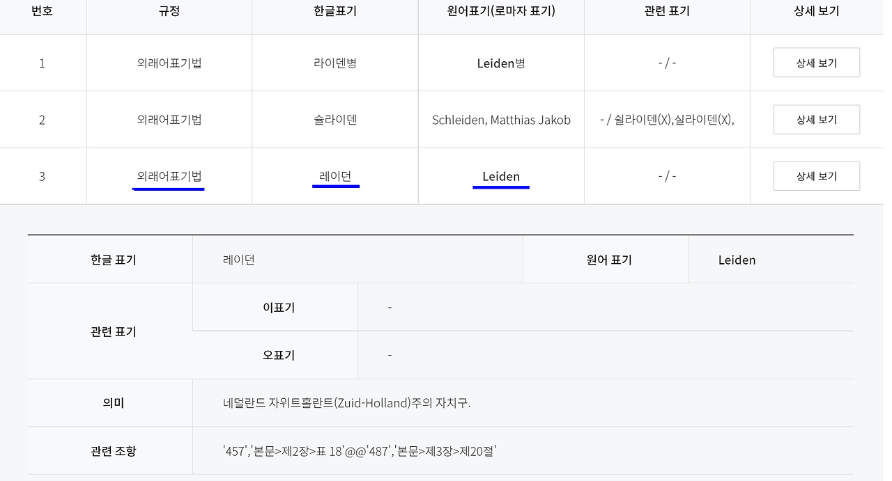 한국어 어문 규정의 외래어 표기법 제2장 표기 일람표, <표 18 네덜란드어 자모와 한글 대조표>를 살펴보자. 외래어 표기법 제2장 표 18에 따르면, 네덜란드어 ‘LEIDEN’은 ‘레이던’과 ‘레이덴’ 두 가지 방식이 모두 가능한 것처럼 보인다.