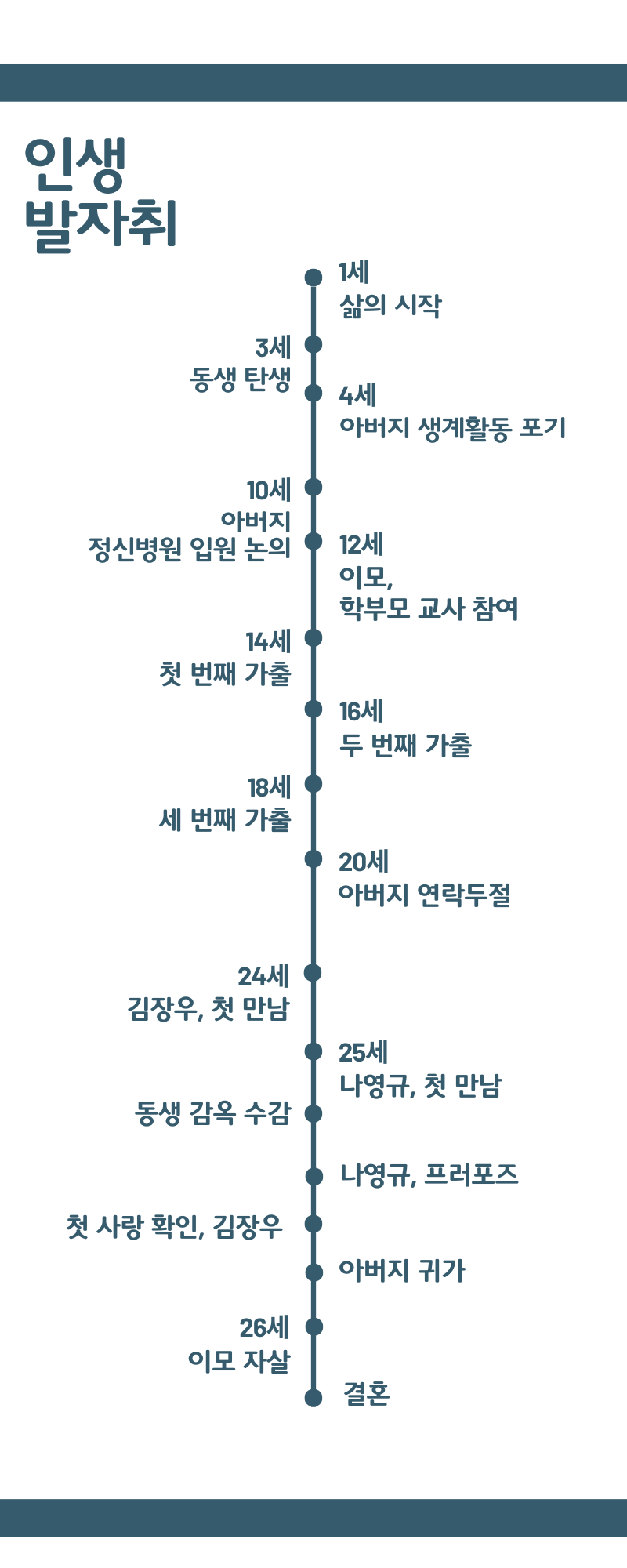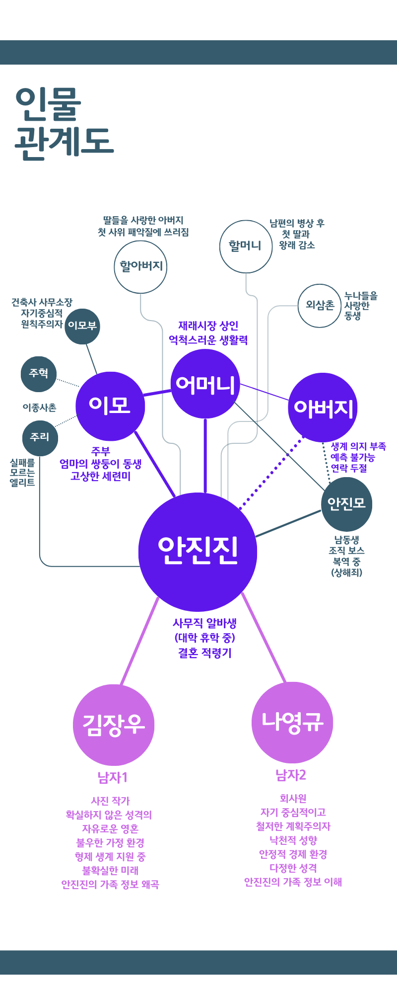[한 달 인물살기]는 한 달간 소설 속 인물이 되어, 온몸으로 그를 이해하는 과정을 담고 있어요. 이미 소설을 읽으신 분도, 처음 접하시는 분도 계실 거예요. 내용을 잘 이해하실 수 있도록 두 가지 시각적 장치를 준비했어요. 바로 <인생 발자취>와 <인물 관계도>입니다. 인생 발자취에서는 인물의 인생을 시간의 흐름에 따라 정리해 봤어요. 인물 관계도는 관계의 중요도를 시각적으로 표현했고요. 원의 크기와 선의 굵기, 그리고 색상의 차이로 관계의 중요도를 확인하실 수 있을 겁니다. 아래 도식을 찬찬히 살펴보시면 안진진의 인생을 한눈에 그려보실 수 있을 거예요. 마음껏 상상하시면서 소설과 인물에 빠져보시길 바랄게요. 참, 중요한 말씀을 안 드렸네요. 본 내용엔 소설의 결과가 포함되어 있어요. 그리고 모든 이야기는 제가 안진진의 시선으로 해석한 거라는 점, 기억해 주세요. 이제, 소설 속으로 함께 들어가 볼게요.