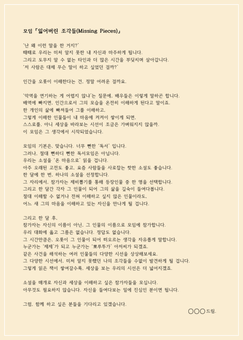 만약 여러분 앞에 이 초대장이 놓여 있다면, 여러분은 어떤 결정을 내리실 건가요? 당시 지인들이 가장 많이 한 질문은, '그럼 연기를 하는 거야?'였습니다. 연기라면 부끄럽다며 손사래를 쳤죠. 아쉽게도 모임에 대본은 없습니다. 일종의 즉흥연기인 셈이죠. 이 말은, 인물을 온전히 이해했을 때 가능한 이야기예요. 맞아요. 쉽지는 않습니다. 하지만 불가능하지도 않습니다. 방식은 이렇게 진행돼요. 소설 속 인물의 페르소나(작가의 심리가 반영된 또 하나의 얼굴)를 걸친 모임원들이 테이블에 마주 보며 둘러앉습니다. 그리고는 소설을 뒤흔드는 사건을 함께 짚어봐요. 각자의 입장에서 사건을 풀이하고, 서로에게 궁금한 것을 묻습니다. 깊게 엮인 관계를 탐색하며, 각자의 심리적 배경을 근거로 인물 간 갈등을 고찰하죠. 이는 모두 자연스러운 대화를 통해 이루어집니다. 우리는 대화로써 관계의 역학을 그리고, 인물의 심리적 배경도 이해하는 시간을 갖게 됩니다. 한 권의 소설이 끝나면, 우리의 마음속엔 무엇이 남을까요. 소설의 이야기일까요. 아니면 그 인물의 서사일까요? 가장 크게 남는 건, 그 인물을 통해 바라본 나의 모습입니다. 짐작했던, 혹은 알지 못했던 나 자신과의 만남, 소설 속 인물에 깊이 빠져들며 우리는 내 안의 또 다른 나를 만나게 됩니다.