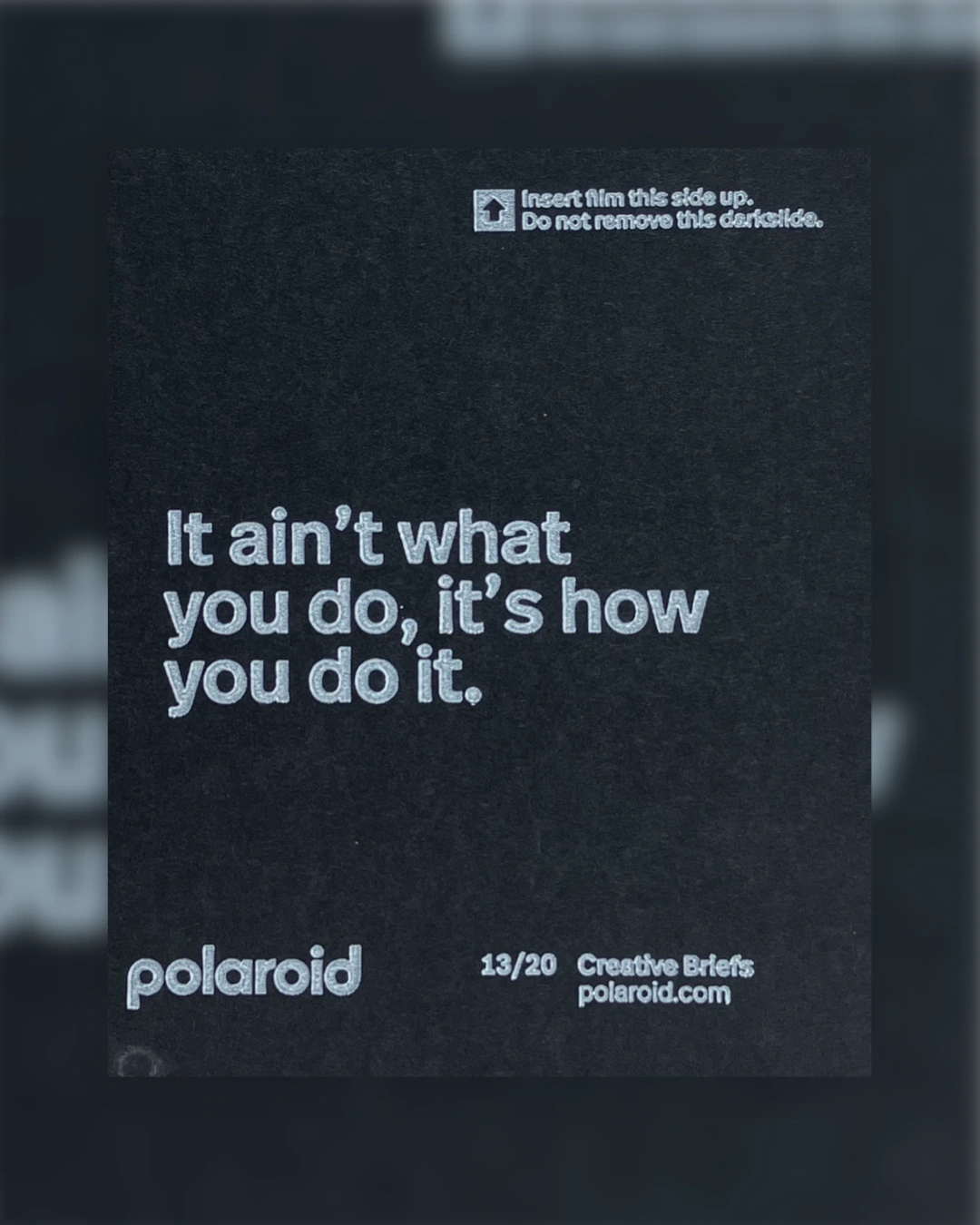 폴라로이드 필름을 찍을 때마다, 제일 처음으로 나오는 다크 슬라이드. 버려도 되는 슬라이드..! 필름 팩의 보호지 같은 역할을 하는데, 필름 팩을 카메라에 넣을 때 빛에 노출되는 것을 막아주고, 다른 오염이나 혹시 모를 손상을 방지해 주는 역할을 한다고 한다. 처음에 사진 찍는 사람이 폴라로이드에 새로운 필름 팩을 집어넣을 때 이 다크 슬라이드가 나왔는데, 이 버려도 되는 첫 장에 영어 문장이 하나씩 적혀있던 것이다..!