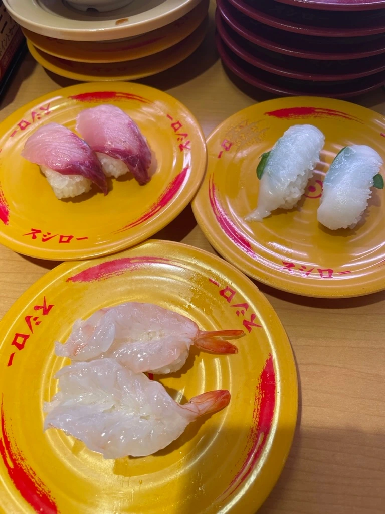 커다란 대하가 올라가 있는 초밥은 개수가 하나이기는 하지만 그래도 이 크기의 새우가 올라간 초밥을 150엔이라는 가격에 먹는다는 게 감동이었다.