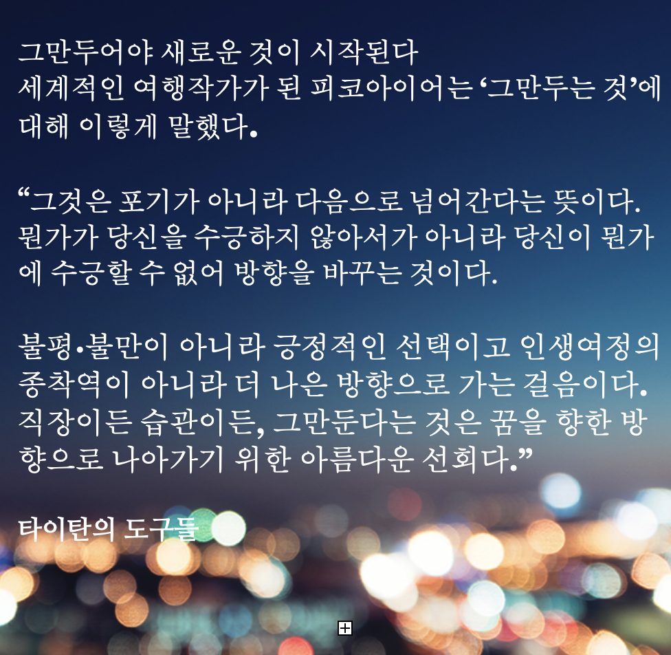 "그것은 포기가 아니라 다음으로 넘어간다는 뜻이다. 뭔가가 당신을 수긍하지 않아서가 아니라 당신이 뭔가에 수긍할 수 없어 방향을 바꾸는 것이다. 불평불만이 아니라 긍정적인 선택이고 인생 여정의 종착역이 아니라 더 나은 방향으로 가는 걸음이다. 직장이든 습관이든, 그만둔다는 것은 꿈을 향한 방향으로 나아가기 위한 아름다운 선회다."