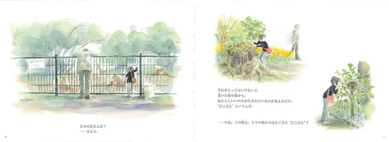 식물학자는 식물원의 규칙도 모르고 이곳저곳을 돌아다니는 말썽꾸러기 소녀 사에라에게 차분히 식물 이야기를 들려준다. 식물도감도 보여주고, 해바라기 씨앗도 준다. 400살 된 아카시아 나무와 3천3백 년 된 나무의 화석도 알려주었다. 250년 된 플라타너스에게는 밤에도, 눈 내리는 날에도 나무를 지탱해 주는 뿌리가 있음을 알려주기도 한다.