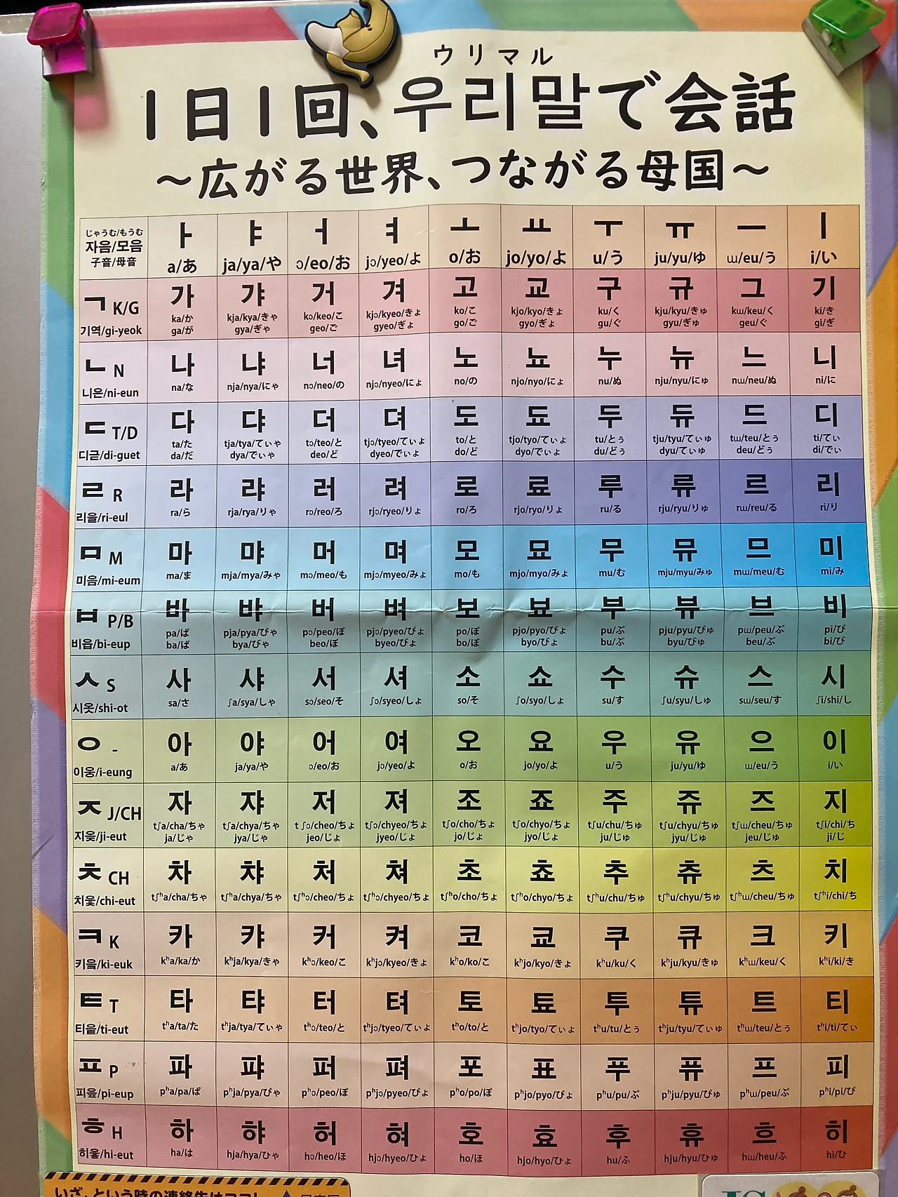 민단 게시판에 붙여 놓은 한글 자음모음표에도 관심을 가진다. 히라가나도 적혀 있으니 '이모', '무지개' 등 간단한 단어 찾아보기 놀이도 잘 따라 한다. 민단에서 자음모음표 포스터도 주셔서, 냉장고에 붙여두고 히마리와 아이 엄마도 언제나 보고 익히도록 했다. 문화교류회에 참가한 성과는 처음으로 5시간 동안 한글로 이루어지는 수업에 참가하고, 자음모음 글자에 관심을 갖게 된 것이다. 드디어 일본어 사이에 한국어 단어를 섞어가며 말하기 시작했다.