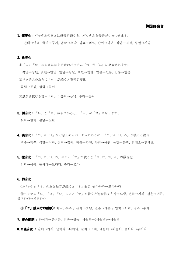 1. 연음화 : 받침 뒤에 모음이 이어지면 받침이 뒷 음절의 모음에 붙는다. 예) 연애→여내, 국어→구거, 음악→으막, 필요→피료, 단어→다너, 직업→지겁, 십일→시빌