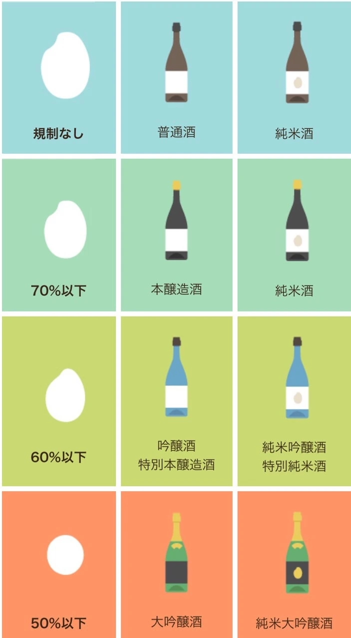 쌀의 겉표면과 배아에는 단백질, 지방 등이 다량 포함되어 있는데, 이러한 성분이 너무 많으면 누룩곰팡이나 효모의 증식, 발효를 지나치게 부추겨 술의 맛이 떨어진다고 한다. 그래서 쌀을 깎아낸다. 깎아내는 정도는 精米歩合(세이마이부아이)로 표시한다. ‘精米歩合 23%’라는 것은 ‘쌀의 77%는 깎아 내고 남은 23%만으로 발효시켜 술을 빚었다’는 뜻이다. 50% 이상 깎아내면 다이긴죠(大吟醸), 40% 이상 도정하면 긴죠(吟醸), 30% 이하는 보통주라고 한다.