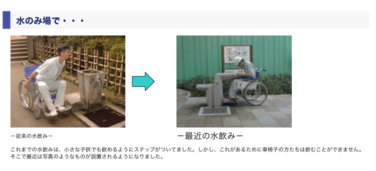 일부 지자체는 휠체어 이용자와 고령자의 불편도 해소하기 위해 단차를 2cm 둔 곳과 단차를 없앤 도로를 함께 설치하기도 한다고 한다. 모든 사람들이 불편 없이 더불어 살도록 하겠다는 배려다. 나중에 언뜻 생각이 나서 인터넷을 검색해 보았더니, 天仁이 전에 살았던 시나가와구(品川区)도 그런 도로 시공 정책을 시행 중이었다. 그러고 나서 도로를 다니다 보니 인도가 끝나고 도로, 신호가 시작되는 곳에는 반드시 시각장애인용 점자 블록이 설치되어 있다는 것을 알게 되었다. 뿐만 아니라 간격이 촘촘한 하수구 뚜껑을 사용해 휠체어 바퀴가 빠지지 않도록 하거나, 공공장소의 수도꼭지 아래까지 휠체어기 들어갈 수 있도록 하여 장애인을 배려하고 있어 깜짝 놀랐다.