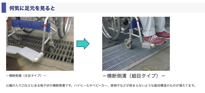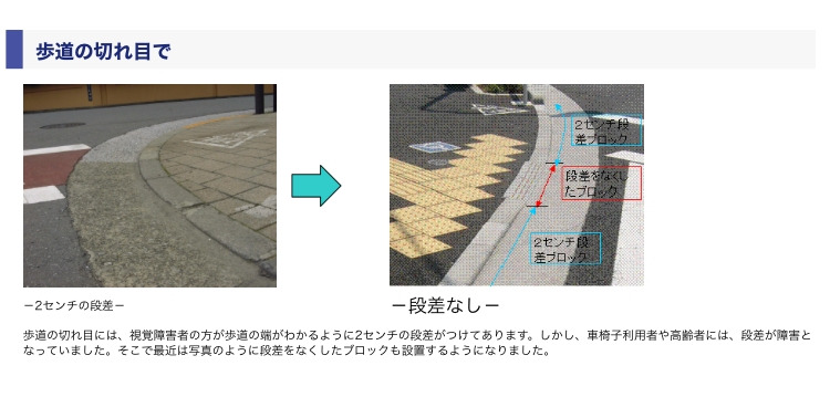 그런데, 히마리를 유모차로 데리고 다니면서 인도와 차도가 높이에 차이가 있어 불편했더라는 경험담도 이야기를 했더니 거기에는 이유가 있다는 것이다. 일본의 각 지자체는 인도와 차도의 높이 차이를 2cm로 시공하도록 지자체 조례에 정하고 있는데, 이유는 시각장애인이 보도와 차도의 경계를 인식하도록 하기 위해서라고 한다. 휠체어나 유모차를 이용하는 사람들이 다소 불편하더라도, 시각 장애인을 위해 일부러 보도와 차도의 단차를 둔다는 것이다.