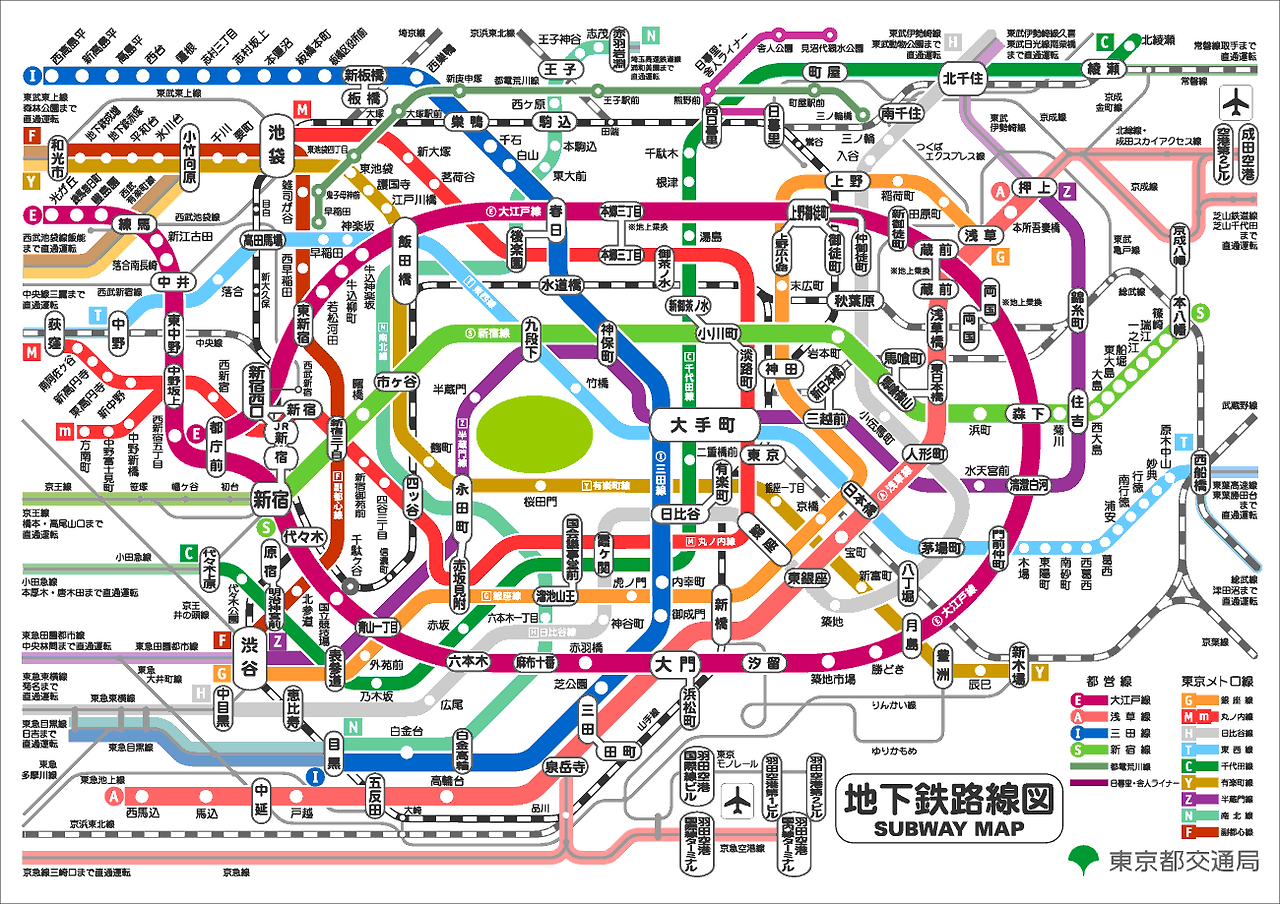 ③Toei 지하철(都営地下鉄): 도쿄도(東京都) 교통국이 운영하는 지하철이다. 아사쿠사선(浅草線), 미타선(三田線), 신주쿠선(新宿線), 오에도선(大江戸線) 등의 4개 노선.