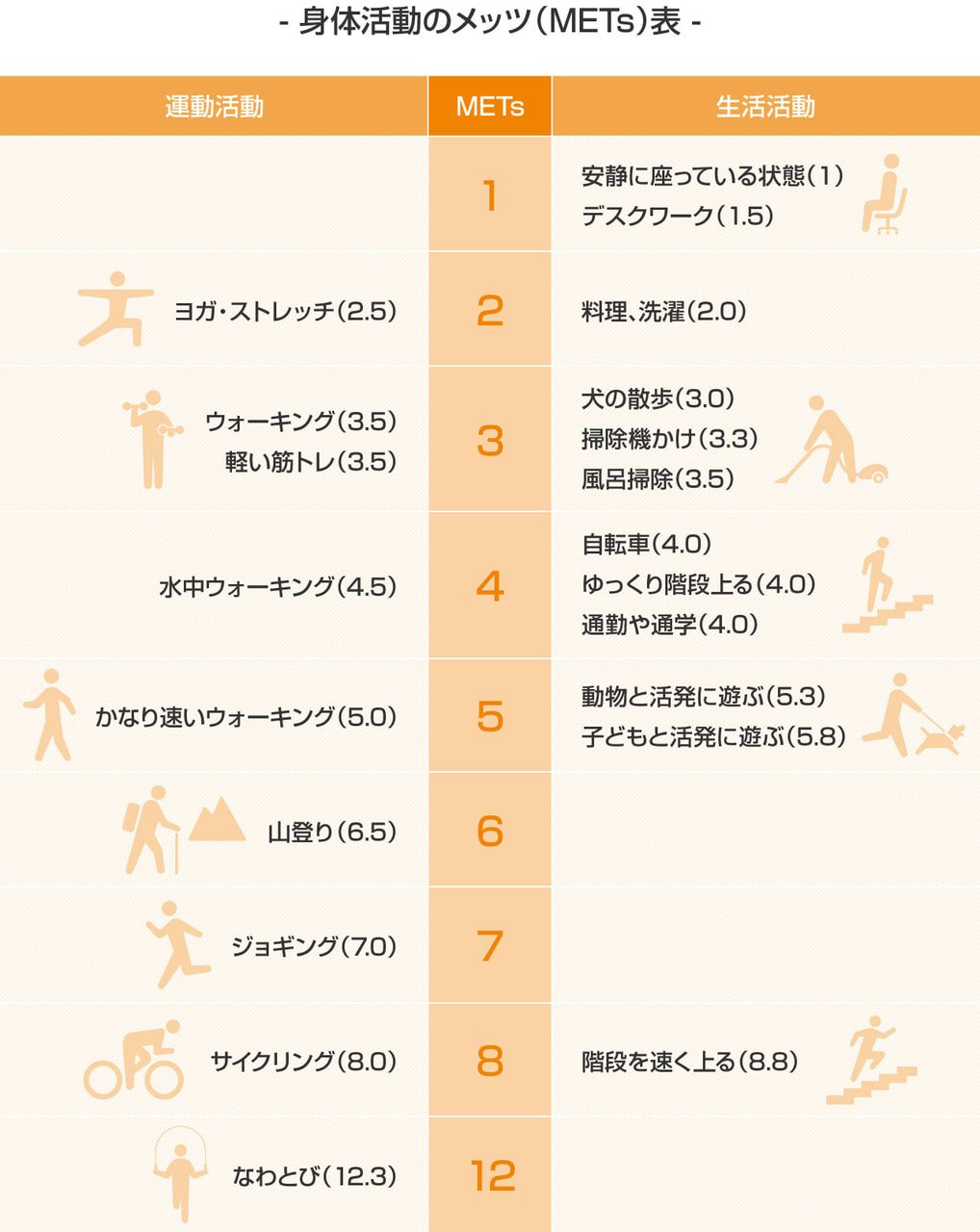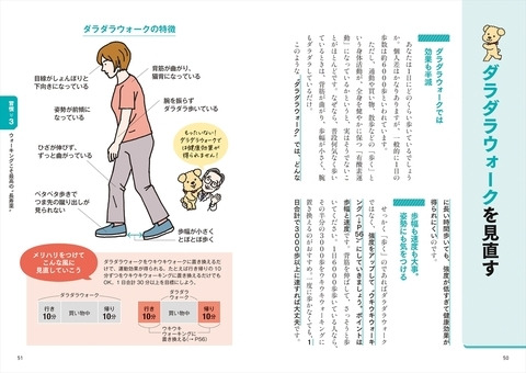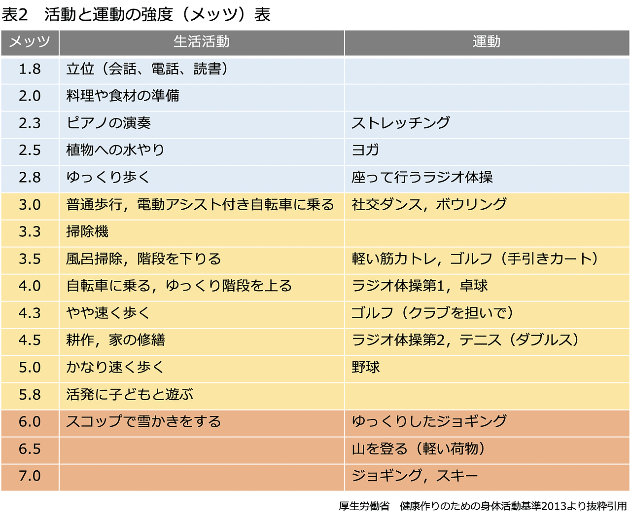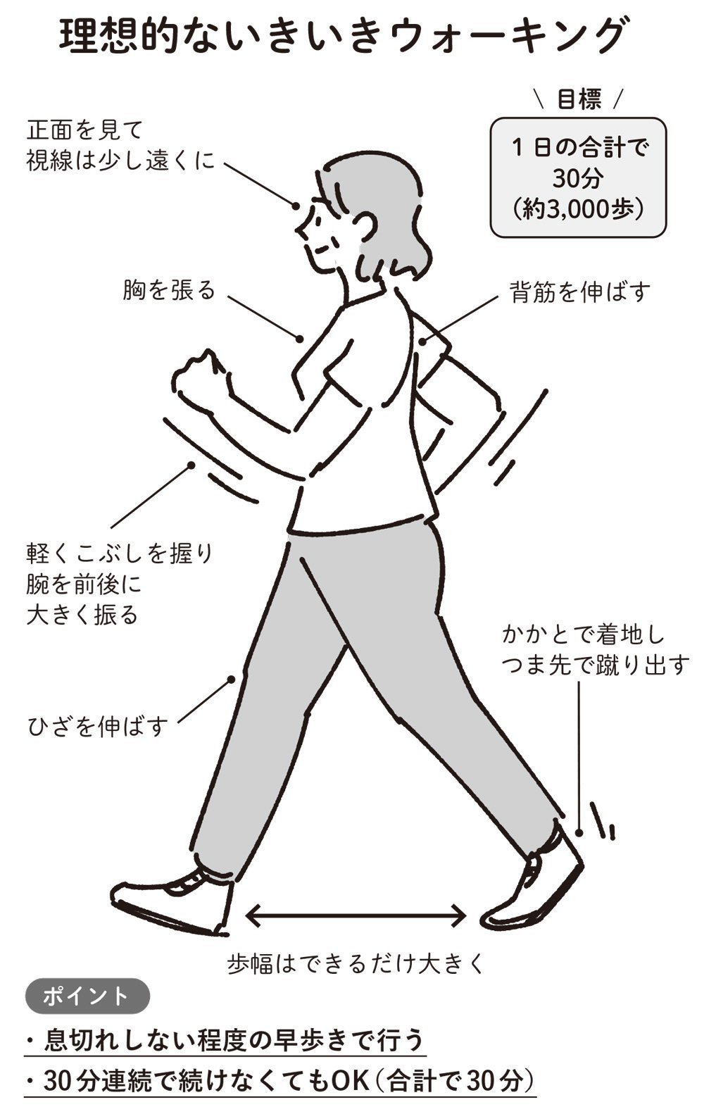 2) 신나게 걷기 [ウキウキウォーキング]: '약간 힘든다'라고 느낄 정도(보르크 스케일(Borg Scale) 12~13)의 운동 강도로 1회 30분 정도로 매일 계속하는 것이 이상적이다. '신나다'라고 느껴져야 오랫동안 계속할 수 있다.