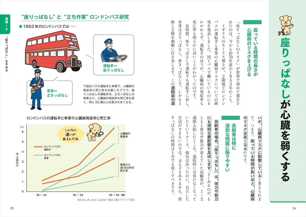 "일본에서는 6분에 한 사람이 심장병으로 돌연사하고 있습니다. 협심증, 심근경색 등의 심장병은 자기도 모르는 사이에 진행되어 갑자기 발작이 일어나는 무서운 질병입니다" 고즈키 마사히로(上月正博) 도호쿠대학 명예교수는 최근 발행한 ≪심장이 좋아하는 9가지 습관(心臓が喜ぶ9つの習慣)≫ 에서 "일상생활 개선이나 운동으로 심장의 건강을 유지하고 심장질환의 위험을 줄일 수 있다"라고 강조한다. 고즈키 교수는 "심장, 혈관에 부담을 주지 않는 몸을 만들 필요가 있습니다. 사람의 몸은 먹은 것으로 만들어져 있으니 '먹는 법'에 비결이 있을 수밖에 없지요. 뿐만 아니라 신체의 내장기능과 운동기능은 생활습관병의 유무, 운동의 질과 양에 많은 영향을 받기 때문에 '생활습관에 대한 마음가짐'과 '운동방법'에 심장 건강을 유지할 비결이 있습니다"라고 말한다. 운동, 식사, 수면, 스트레스 완화 등의 고즈키 교수가 말하는 심장병 예방을 위한 9가지 실천하기 쉬운 습관을 요약한다.
