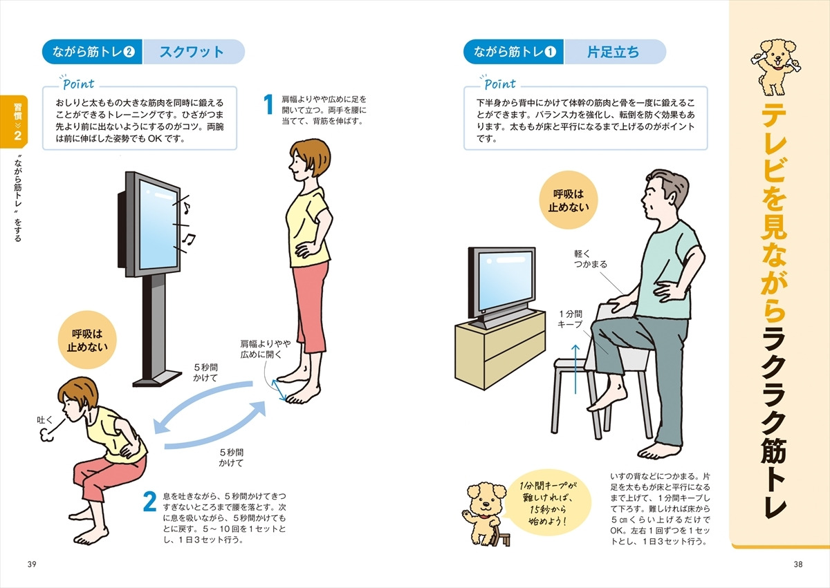 3) TV를 보면서 가벼운 근력운동을 하자. 서서 한쪽 다리 들기, 스쾃, 의자에 앉아 다리 들기, 의자 잡고 일어서기, 서서 뒤꿈치 들기, 런지, 힙 리프트 등.