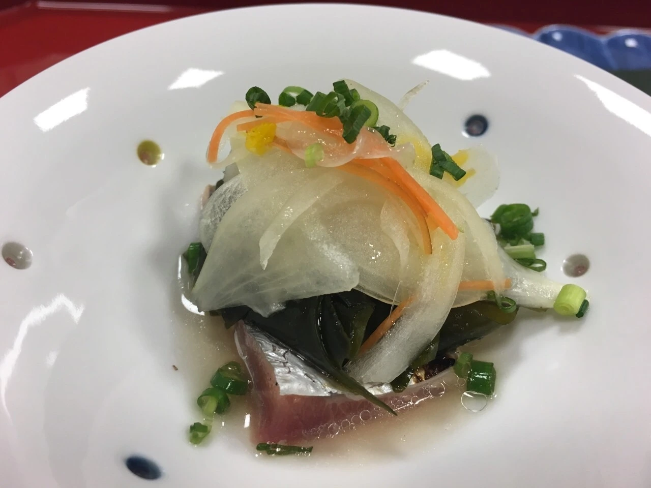 본격적인 요리의 시작으로 생선회가 스노모노(酢の物, 식초로 양념한 요리)와 함께 나온다. 흰 살 생선을 먼저 먹고 붉은 살 생선을 나중에 먹는다. 오무코(お向こう)라고도 한다.