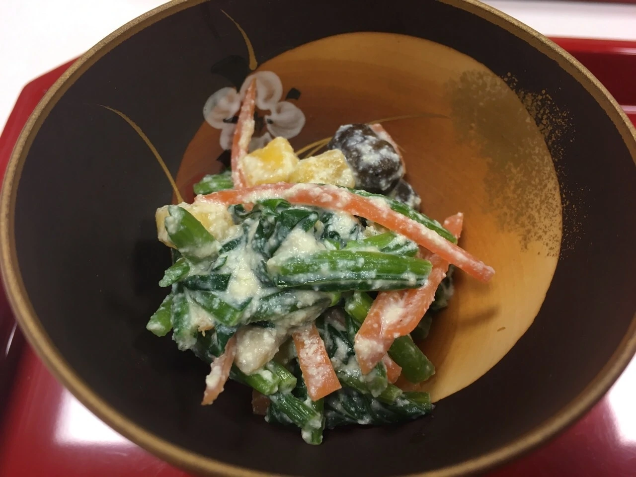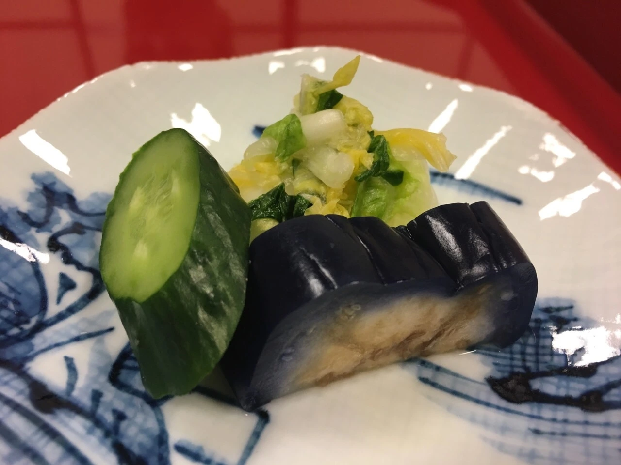 히타시모노(浸し物, 푸른 잎채소를 데쳐 간장으로 무친 것), 스노모노(酢の物, 식초로 양념한 요리), 아에모노(和え物, 무침)를 각각 작은 그릇에 담아낸다.