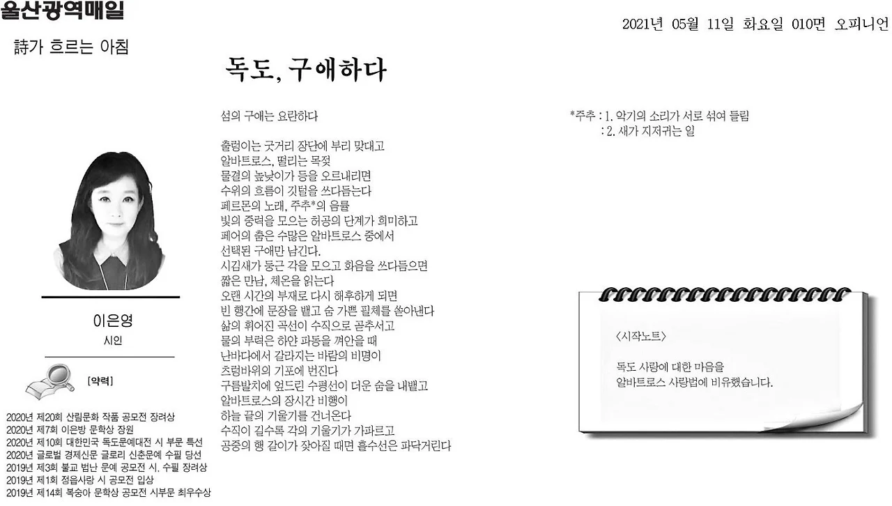 초등학교 친구인 이은영 시인의 시 ‘독도, 구애하다’가 신문에 게재되었다. 독도를 사랑하는 마음을 알바트로스 사랑법에 비유한 시인데 참 아름답다. 주변 이야기들을 일기처럼 늘 적고는 있지만, 기획부 출신 天仁의 글쓰기 습관이 사실적, 논리적인데 비해 시인의 시는 단어의 선택에서부터 아름다움이 저절로 느껴진다.