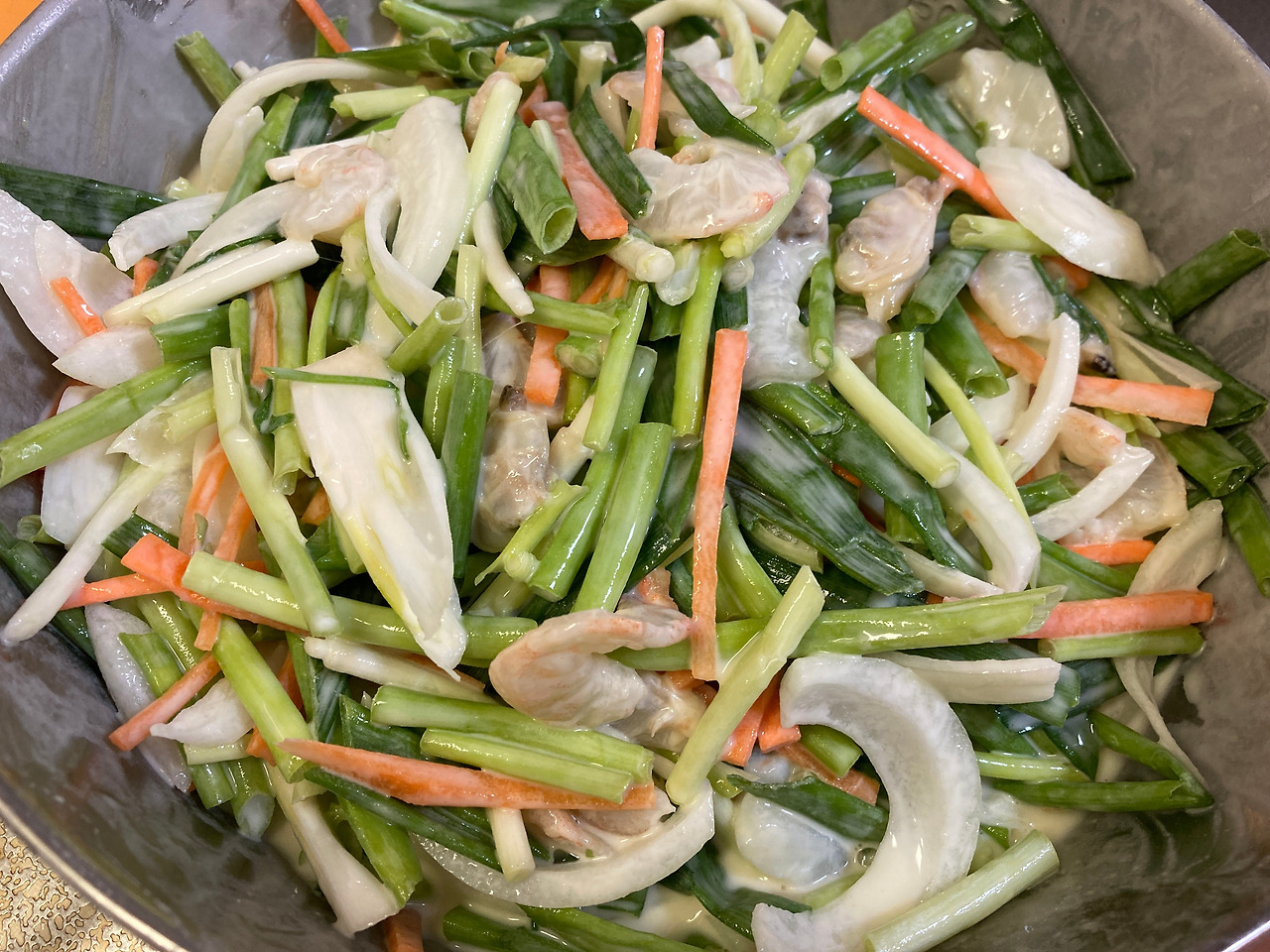 2. 재료 : 해산물 믹스 240g, 쪽파 3 봉지, 양파 1/2개, 당근 1/3개