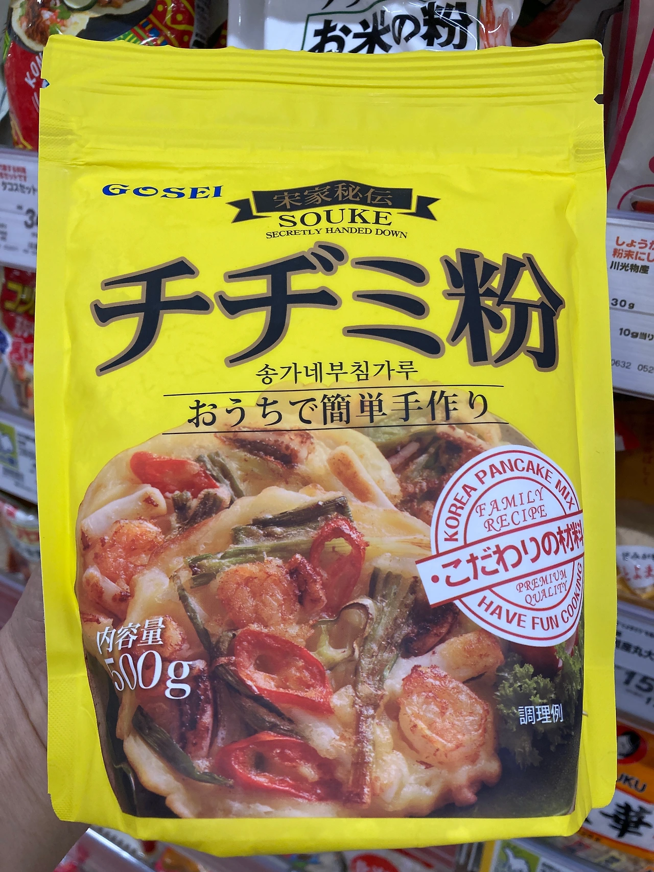 이후 일본에 수입되는 한국산 ‘송가네 부침가루’를 알게 되었다. 부침가루는 밀가루 중력분에 소금과 설탕, 전분과 베이킹파우더 등을 약간씩 섞어서 부침 요리에 적합하게 만든 상품이다. 송가네 부침가루에는 밀가루 외에 옥수수가루, 시즈닝스 파우더(포도당, 마늘가루, 소고기 가루, 양파 분말), 소금, MALTODEXTRIN, 가공전분 등이 들어있다. 한국산 다른 제품에는 밀가루 외에 찹쌀가루, 부침 양념 믹스(정제소금, 전분, 마늘가루, 앙파 가루, 후춧가루), 감자전분, 정제소금, 설탕, 베이킹파우더, 비타민B2 등이 들어가기도 한다.