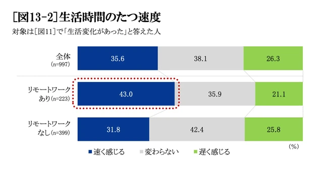 작년 시계 제조업체 세이코의 조사에 따르면 코로나 이후 재택근무자의 70% 이상이 '시간의 흐름에 대한 감을 느끼기 어렵고, 재택근무를 하지 않는 사람들에 비해 시간이 빨리 흐르는 것 같다’라고 답했다고 한다. 이에 대해 치바대학(千葉大学)의 이치카와 마코토(一川誠) 교수는 재택근무 위주로 휴일에도 외출하는 일도 없다 보니 출퇴근할 때보다 하루나 일주일의 편차가 줄어들기 때문일 것이라고 해석한다. 자숙 기간 중에는 마음에 남을 만한 이벤트가 없기 때문에 충족감이 부족하고, 운동량이 줄어들기 때문에 대사가 낮아지는 것도 눈 깜짝할 사이에 시간이 흐른 것처럼 느끼게 되는 원인이라고도 한다.