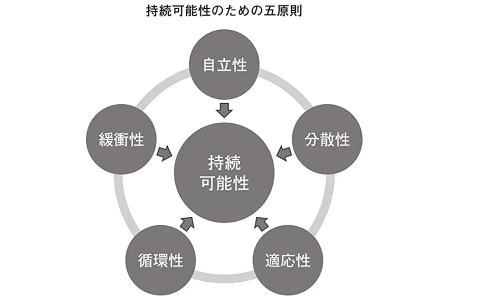저자는 “근대 이후의 일본은 서양 물질문명을 뒤쫓은 결과 물질적으로는 풍요로워졌지만 극단적인 세계화와 도시화가 진전되어 결과적으로 국가사회로서의 자립성, 자연과 사회의 순환성, 인구의 분산성, 삶의 적응성을 잃어버렸다.”라고 주장한다.