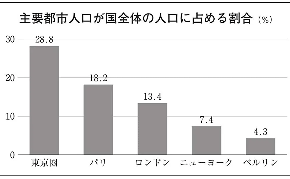 세계 주요 도시의 전체 인구 대비 비율은 일본이 28.8%로, 파리 18.2%, 런던 13.4%, 뉴욕 7.4%, 베를린 4.3% 보다 월등히 높다. (주. 사실 이 문제는 한국이 더 심각하다.) 수도권의 인구 집중률도 세계 최악이지만, 식량 자급률도 24%로 프랑스의 190%, 미국 120%, 영국의 87% 등 다른 선진국 중에서도 극단적으로 낮다. 그래서, 일본은 분쟁이나 전염병 등 글로벌 수준의 위기가 일어났을 때 살아남기 어려운 위기에 처할 리스크가 매우 크다. 이미 짐 로저스 로저스홀딩스 회장은 30년 후 일본 거리에서는 폭동이 일어날 수도 있으며, 자신을 지키기 위해 총이 필요하게 될지도 모른다고 경고한 바 있다.