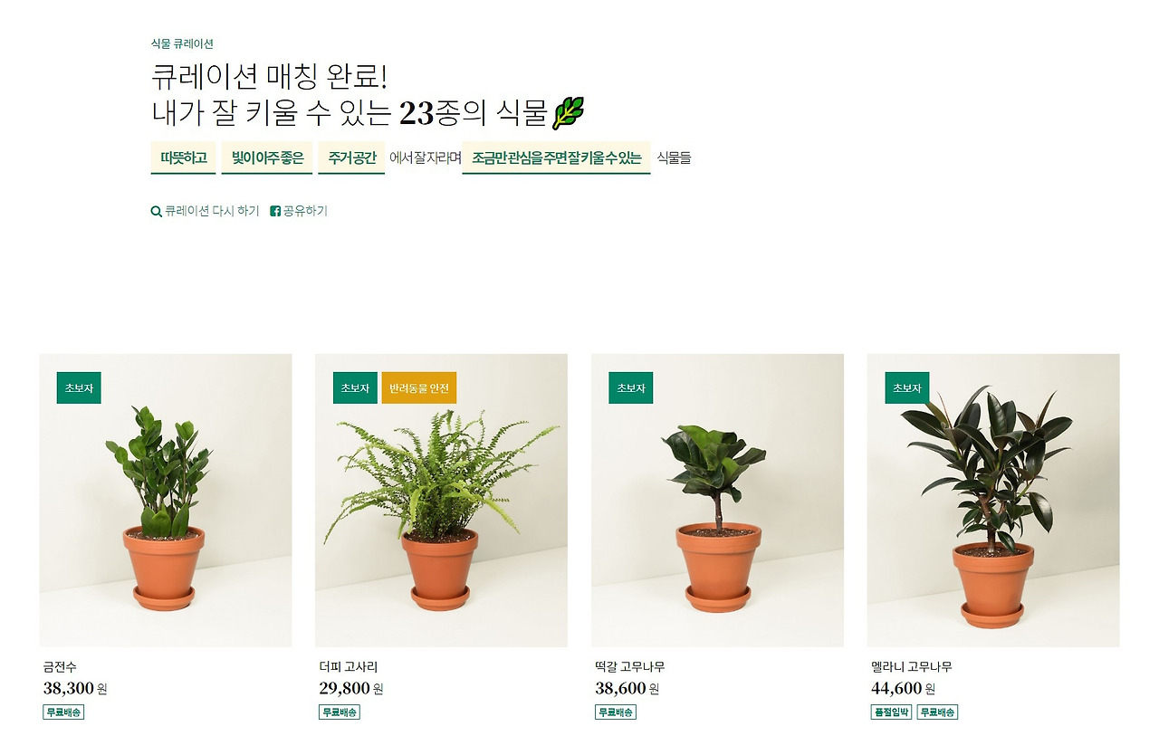 나는 완전 식물 킬러까지는 아니지만 식물을 잘 기르는 편은 아니다. 우리 집은 낮에 햇빛이 많이 드는 환경인데 창가에 화분을 두니까 오히려 빛이 너무 많이 들어 식물이 금방 죽곤 했다. 그래서 테이블야자를 수경으로 물병에 담아 키워도 봤는데 그것도 오래 못 갔었다.. 도대체 나에게 잘 맞는 식물은 뭘까? 궁금해서 알고리즘으로 나에게 맞는 식물 큐레이션을 해준다는 그리니파이에 들어가서 몇 개의 질문에 답을 하고 추천을 받아보았다. 그랬더니 금전수, 돈나무가 첫 번째 추천이다ㅋㅋ 올해 이걸 들이면 집에 돈이 좀 들어오려나..