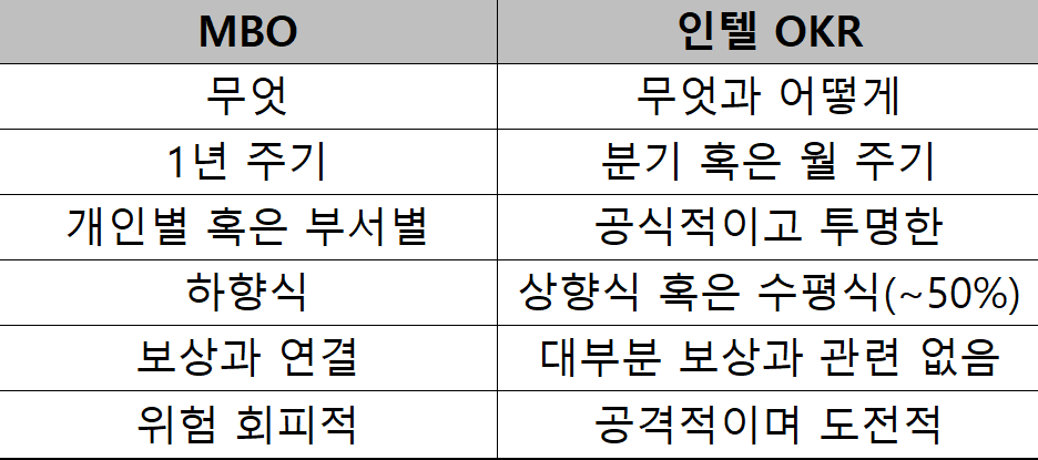 조직 관리의 1인자인 피터 드러커에 의해 1954년에 처음 소개된 MBO는 초기에는 개인의 동기부여 개념으로 사용되었으나, 직원 및 조직의 성과 관리와 교육, 조직 관리 등의 대표적 경영 관리 시스템으로 사용되고 있다.하지만 탑 다운 방식의 MBO의 시대는 지났다도 하고, 바텀 업의 상향식 수평적 시스템의 OKR이 시대의 결을 같이 하고 있다고 한다.