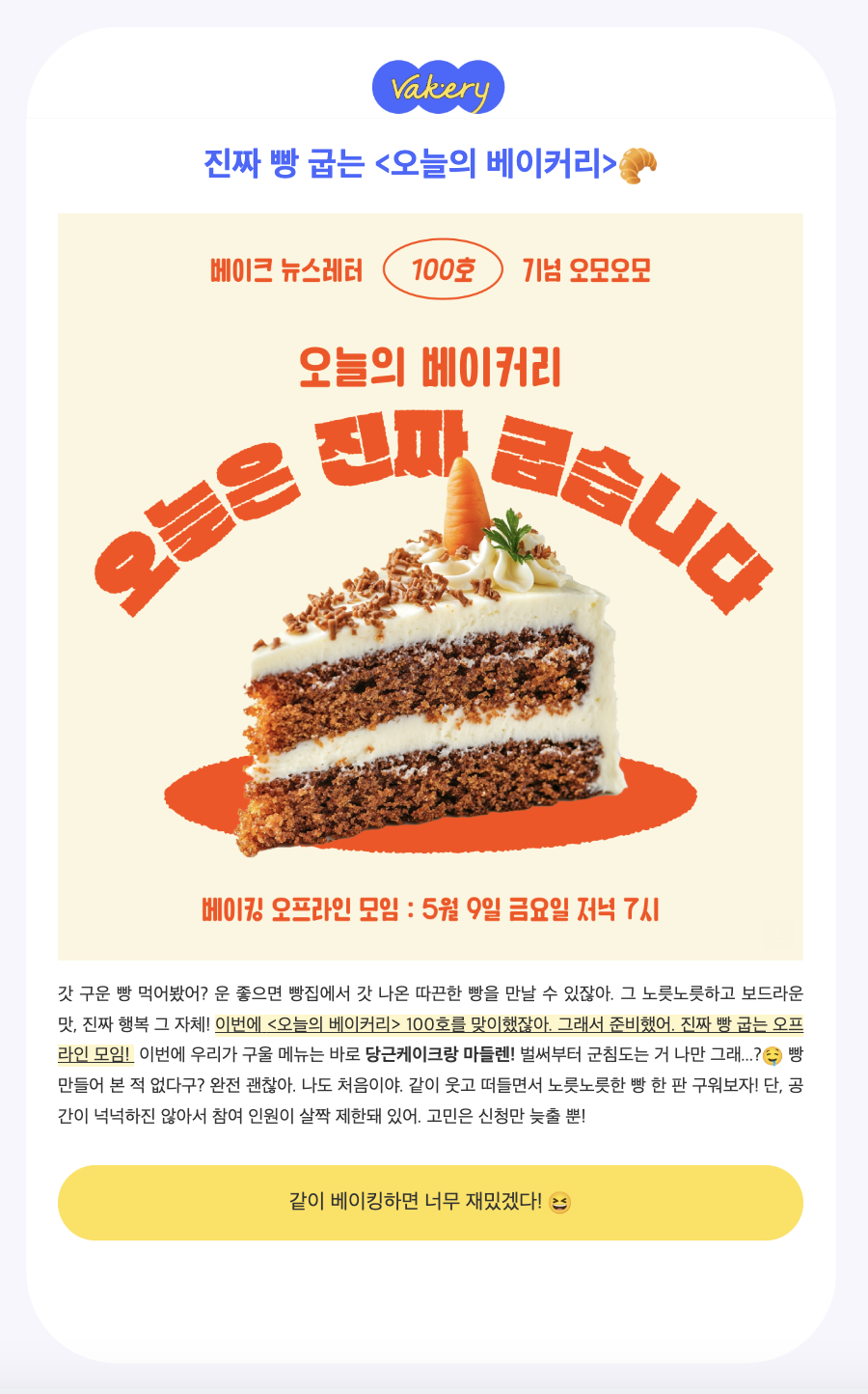 환경 문제에 관심이 있다면, 플라스틱 물병에 라벨 떼기 미션을 함께 수행해보는 소셜 액션을 기획해볼 수도 있고, 같이 다양성 영화를 보러가는 모임을 기획해볼 수도 있다. 나는 베이킹을 해오던 터라, 베이킹에 관심이 있는 사람들과 함께 빵을 구워, 무료 나눔 밥차를 운영하는 기관에, 참여자들과 함께 구운 빵을 100개 나눔하는 일을 진행했었다. 재능기부를 통한 가치있는 일 경험이 목적이었고, 그게 벌써 재작년이었는데 참 뿌듯하고 재미있었던 프로젝트였다. 이번에 '베이크'가 뉴스레터 발행 100호를 기념으로, 베이크 플랫폼에서 활동하는 멤버들과 베이킹을 하는 모임을 기획하게 되어, 오랜만에 다시 또 베이킹 클래스를 열게 되었다.