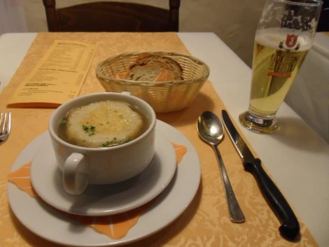 이곳에서 그렇게 유명하다는 송아지 스테이크를 시켰고, 조금 욕심 내어 따뜻한 수프와 맥주 한 잔을 시켰다. 생각보다 추운 날씨였기에 얼어있는 몸을 살짝 덥히려는 심산이었다. 따스한 국물과 맥주가 몸을 한껏 데워주자 기다리던 송아지 스테이크가 나왔다.
