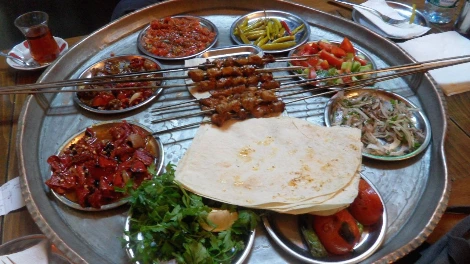 이스탄불에 오면 꼭 먹어야 하는 세 가지 음식이 있다. 그중 하나가 이미 언급한 오렌지 주스고, 이게 바로 두 번째 음식이다. 양, 소, 닭으로 구성된 꼬지와 여덟 가지 야채, 그리고 구운 빵을 곁들여 먹는 쟁반 케밥은 어제 먹은 쾨프테시시와는 비교가 안 될 정도로 맛있었다. 어제저녁에 먹은 케밥이 살짝 관광객들을 위해서 가공된 맛이었다면, 쟁반 케밥은 현지인들을 위한, 정제되지 않은 토속적인 맛을 함유하고 있었다. 다행히 우리는 터키식 향이 입맛에 맞았는지 아주 맛있게 저 모든 것을 비울 수 있었다. 특히나, 이스탄불 사람들이 하루에 세 잔 이상 마신다는 '차이'라는 차는 자극적인 케밥의 맛을 달짝지근하게 잘 잡아줬다.